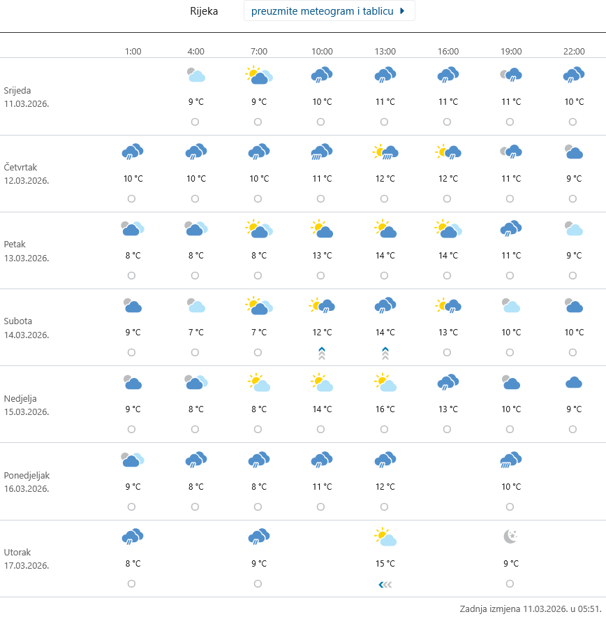 Kako pokazuje meteogram DHMZ-a za područje Rijeke i u narednih 7 dana očekuje se promjenljivo vrijeme s povremenom kišom, a najviše bi trebalo pasti tijekom sutrašnjeg dana uz razvedravanje u poslijepodnevnim satima.