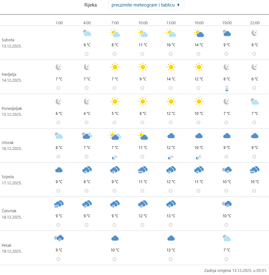 Stabilno i s mnogo sunca bit će i sutra, pa i početkom narednog tjedna. Kako pokazuje meteogram DHMZ-a za područje Rijeke nova promjena vremena očekuje se sredinom tjedna kada bi na Kvarneru trebalo započeti kraće kišno razdoblje.