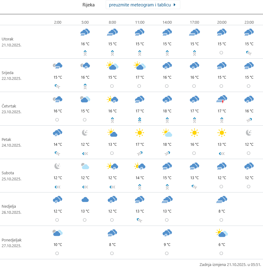 Kako pokazuje meteogram DHMZ-a danas se na riječkom području očekuje obilna količina kiše, koja je padala veći dio protekle noći. Do smirivanja bi moglo doći sutra, ali će i u ostatku tjedna na Kvarneru biti dosta obilnih padalina. Za vikend, odnosno u nedjelju se očekuje i pad temperature zraka.