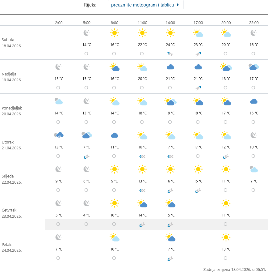 Kako pokazuje meteogram DHMZ-a za područje Rijeke u nedjelju i tijekom narednog tjedna nema naznaka za kišu, ali se očekuju blago niže temperature zraka.