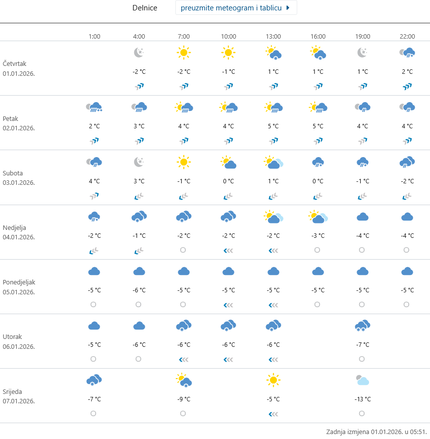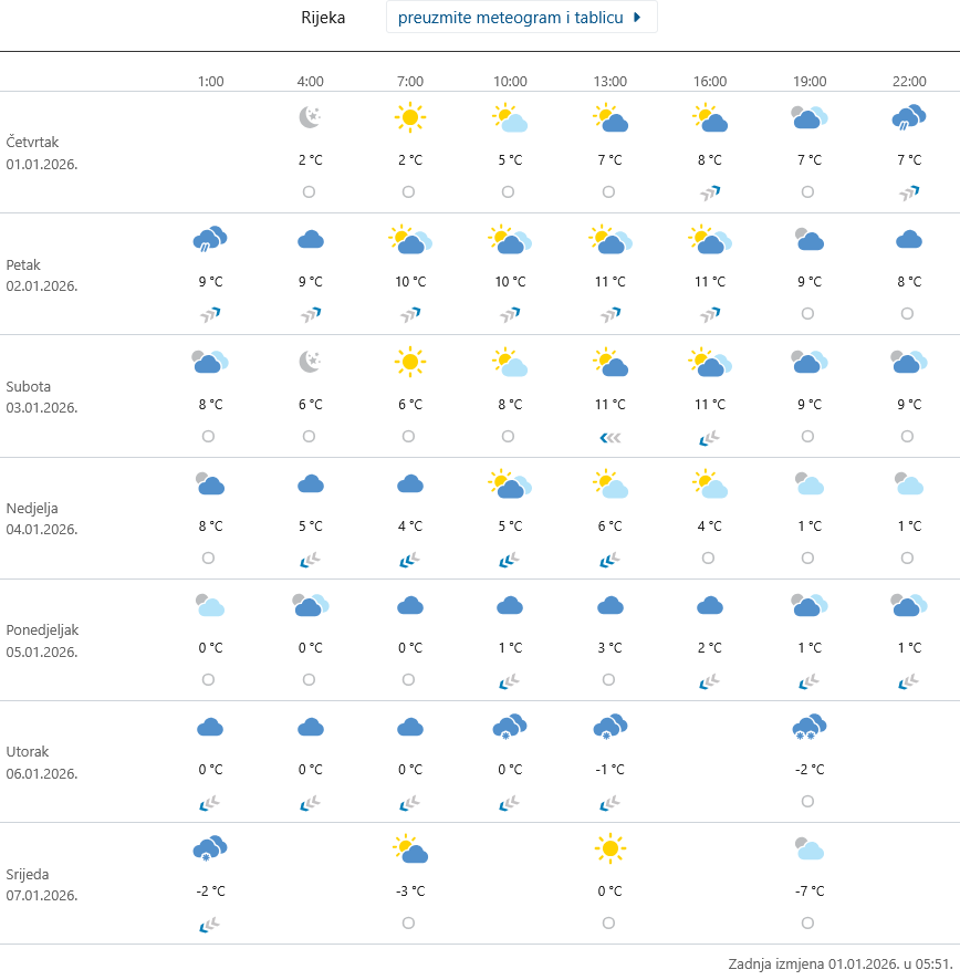 Kako pokazuje meteogram DHMZ-a za područje Rijeke u narednih 7 dana očekuje nas novi val hladnoće, snijeg bi mogao biti moguć čak i u nizinama, a jutarnje i noćne temperature bit će u minusu.