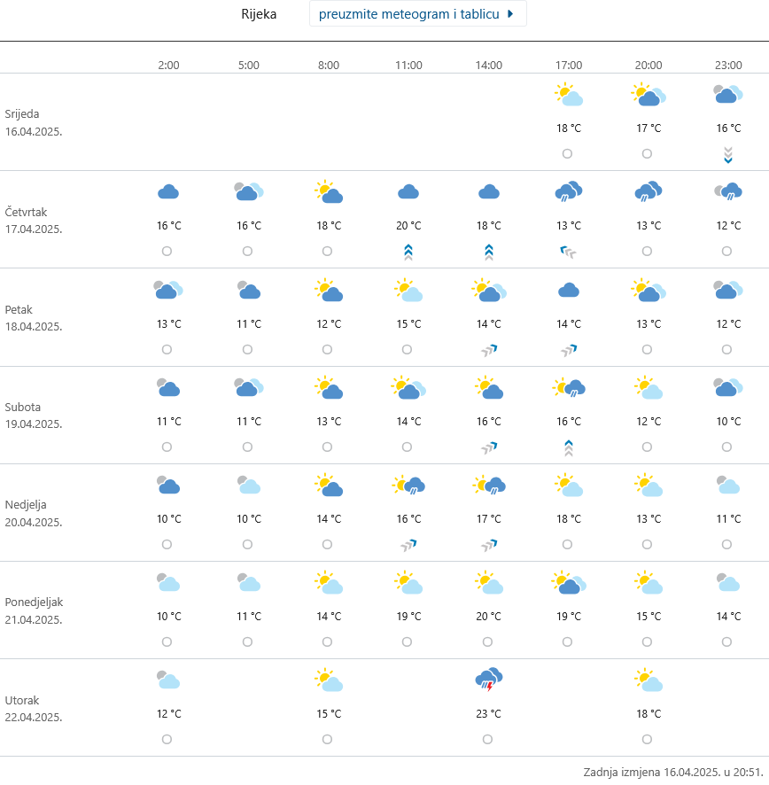Kako pokazuje meteogram za područje Rijeke u narednih 5 dana ipak će biti manje kiše nego proteklih dana, tako će i za blagda biti dosta sunčanih razdoblja.