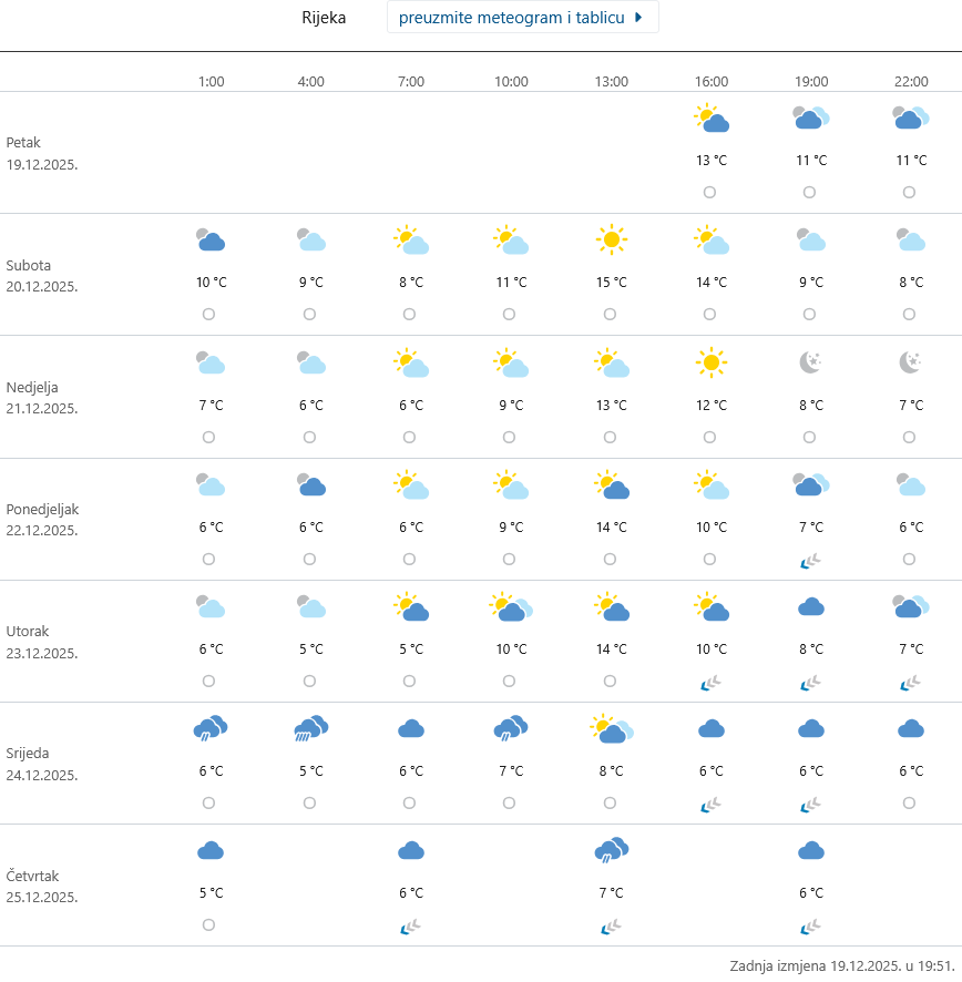 Mateogram DHMZ-a u narednih 7 dana ne previđa drastične promjene vremena, ali bi na Badnjak i Božić temeprature na području Rijeke ipak trebale biti nešto niže, a moguće je i malo kiše.