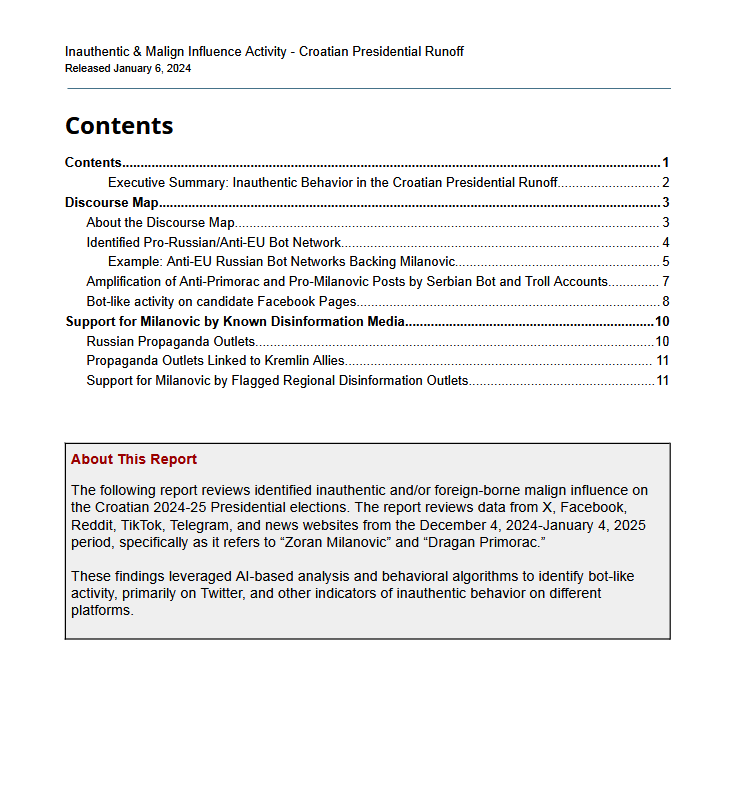 Istraživanje objavljeno na web stranici ove organizacije poznate po istraživanju dezinformacija i zloćudnih aktivnosti u sukobima poput onih u Ukrajini, Sudanu i Mianmaru, otkrilo je neautentično ponašanje računa na društvenim mrežama poput X-a (bivši Twitter), Facebooka, Reddita, TikToka i drugih društvenih mreža, a analizirane su i web stranice s vijestima u razdoblju od 4. prosinca 2024. do 4. siječnja 2025. godine. Ključni pojmovi koji su istraživani bili su „Zoran Milanović” i „Dragan Primorac”, a cilje je bio razotkriti mrežu proruskih, anti-EU i anti-NATO botova.