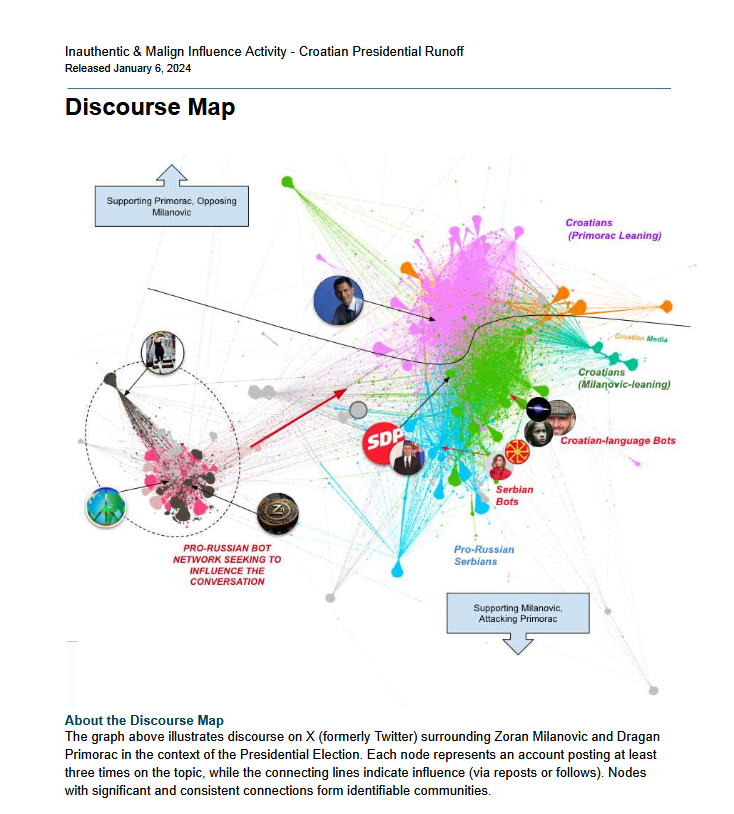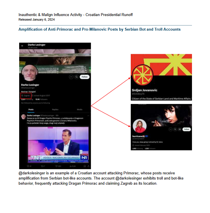 U izvješću se navodi da su se unutar ovih mreža posebno istaknuli srpski elementi, koji su svojim objavama napadali Primorca dok su istovremeno promovirali Milanovića kao idealnog kandidata. Ta aktivnost nije ograničena samo na X (Twitter); botovi i slični računi pokazali su zavidnu razinu koordinacije i na drugim društvenim mrežama poput Facebooka.