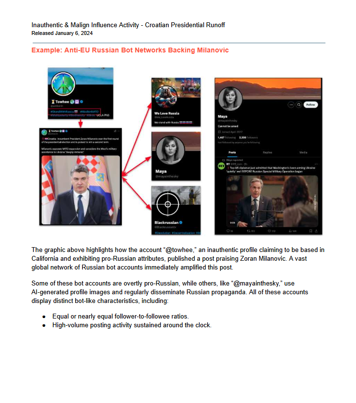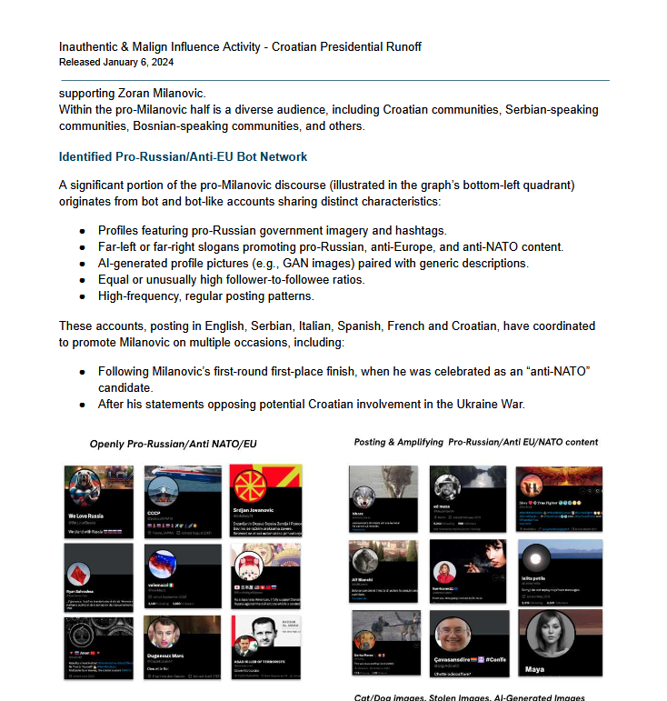 Kako se navodi u izvješću CIR-a, računi često koriste AI-generirane profilne slike, slogane proruskog sadržaja i imaju neobične obrasce objavljivanja. Aktivnosti su se intenzivirale nakon što je Milanović osvojio 49,1 posto glasova u prvom krugu izbora, dok je njegov protukandidat Dragan Primorac dobio 19,35 posto. Milanovića se u izvješću opisuje kao „otvorenog kritičara zapadne vojne potpore Ukrajini”, te podsjeća kako je ranije rekao da Hrvatska ne bi trebala zauzimati strane i da bi se trebala držati podalje od globalnih sporova, unatoč tome što je članica NATO-a i EU-a.