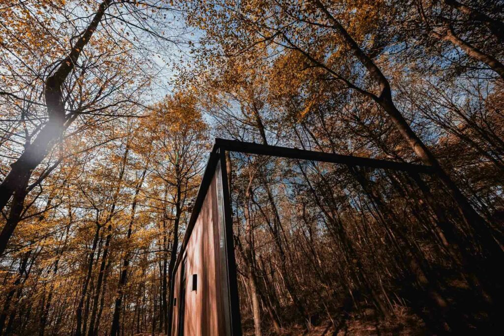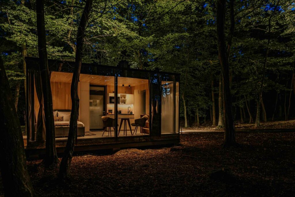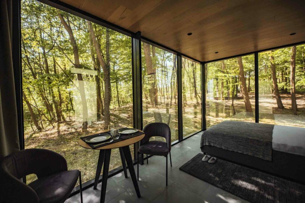 Riječ je objektima čiju fasadu definiraju staklo i drvo. Štoviše, staklo prema van djeluje kao zrcalo i potpuno je nepropusno prema unutrašnjosti. Tako se vani dobiva refleksiju koja dodatno pojačava efekt okoline jer se boja šume preslikava i na te zanimljive fasade. S druge strane, unutrašnjost, zbog dominantno staklenih površina dobiva sliku potpune uronjenosti u okoliš. Pojednostavljeno rečeno, ne zna se je li bolje gledati u zanimljive kućice ili boraviti u njima.