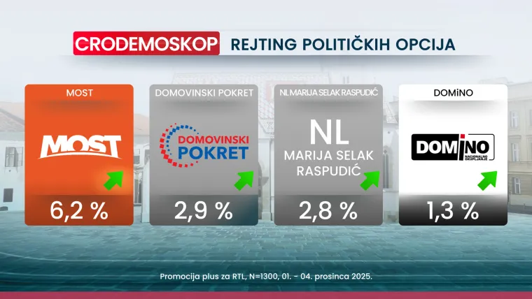 Most je na četvrtom mjestu sa 6,2 posto podrške (u odnosu na 5,8 posto iz prethodnog mjeseca). Na petom je mjestu s 2,9 posto izbora je Domovinski pokret (prema 2,6 posto iz studenog). StrankaMarije Selak Raspudićbilježi 2,8 posto podrške (prema 2,6 posto iz studenog). Slijedi Domino s 1,3 posto (prema prošlomjesečnih 1,4 posto).