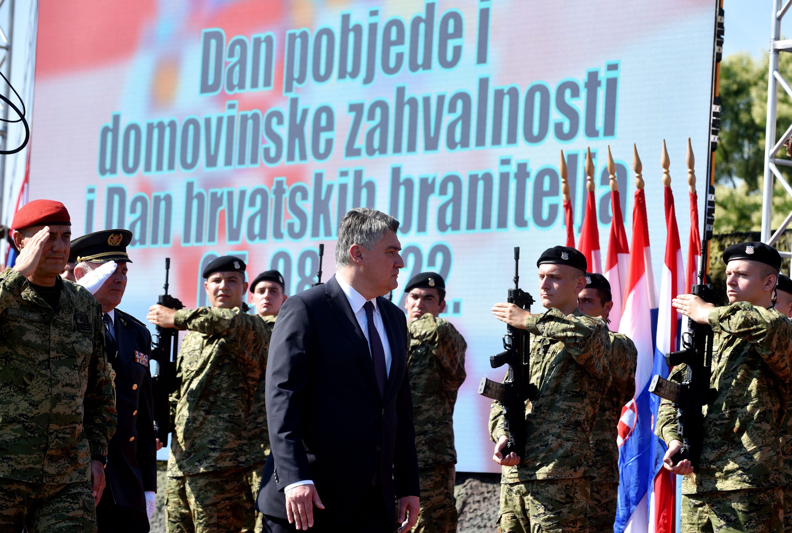 NOVO! 9:46 – Podnesen je prijavak vrhovnom zapovjedniku Zoranu Milanoviću, dok je na Kninskoj tvrđavi podignuta hrvatska državna zastava. Himnu je izvela Barbara Suhodolčan. Premijer Andrej Plenković i predsjednik Milanović stoje jedan uz drugoga, prema protokolu.