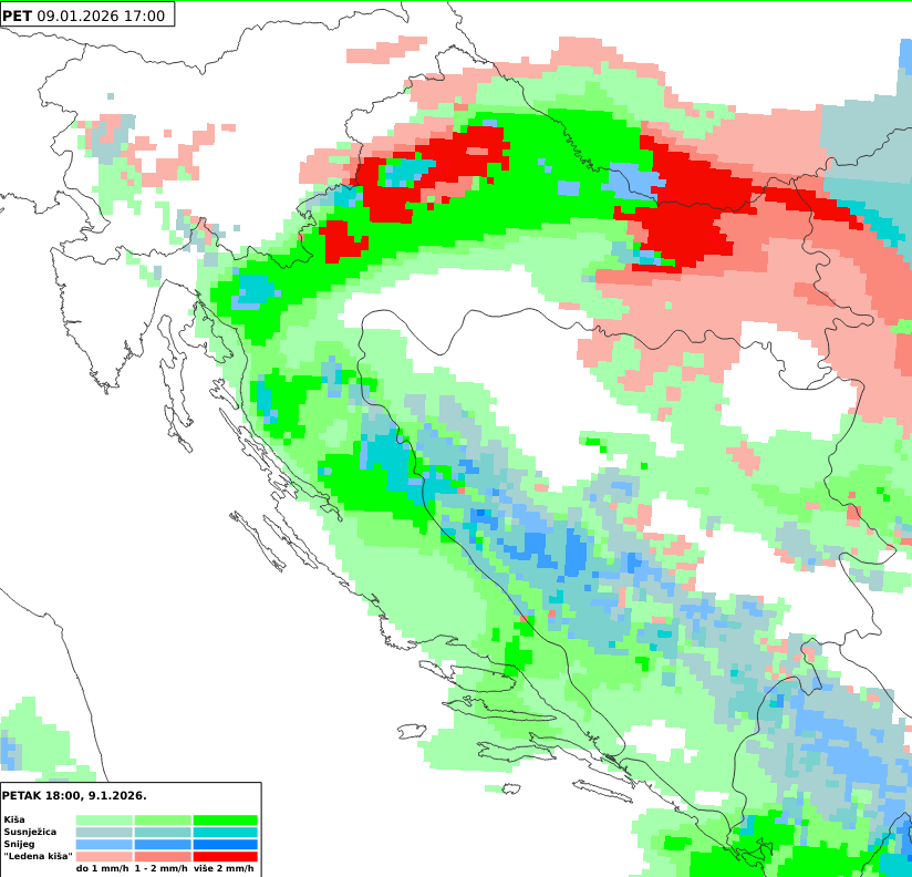 Oborine u petak, 9. siječnja 2026. u 18 sati : Crvena boja označava kišu koja se smrzava, plava boja susnježicu i snijeg, a zelena kišu. Različite nijanse boja predstavljaju različite intenzitete oborine / Foto DHMZ