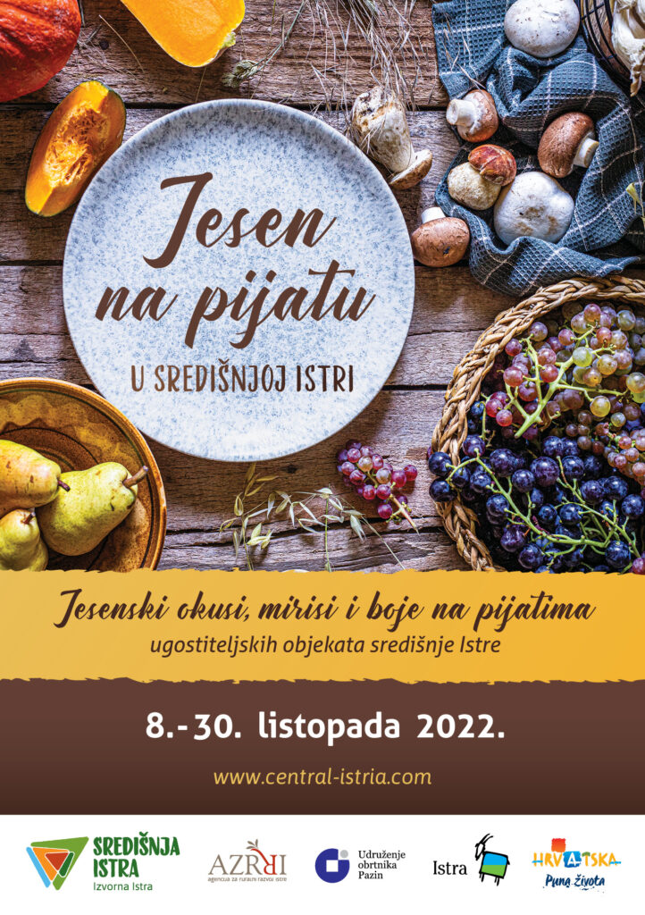 Manifestacija Jesen na pijatu u središnjoj Istri odvijat će se od 08. do 30. listopada 2022. u ugostiteljskim objektima na području TZ središnje Istre. U navedenom razdoblju, svaki dan u redovnom radnom vremenu, ugostitelji će nuditi razna tradicionalna jela istarske kuhinje spravljena od jesenskih namirnica našeg podneblja, a sve u cilju jačanja gastronomske ponude središnje Istre te daljnjeg povezivanja OPG-ova i ugostitelja u razdoblju posezone.