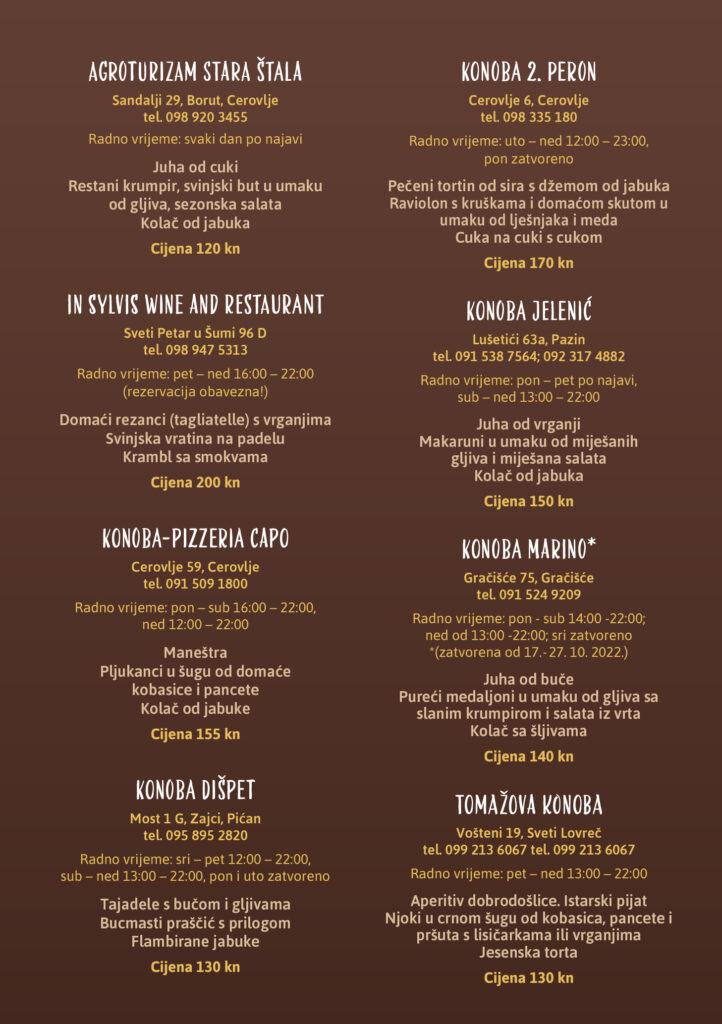 Jesenski menu sastojat će se od predjela, glavnog jela i deserta, a nudit će se po promotivnoj cijeni. U manifestaciju je uključeno osam ugostiteljskih objekata, koji nude sljedeće menije: