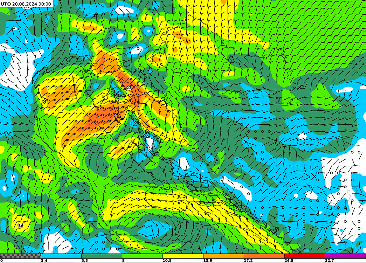Slika 2. Udari vjetra (m/s) u utorak 20. kolovoza 2024. u 2 h po lokalnom vremenu. Izvor: ECMWF