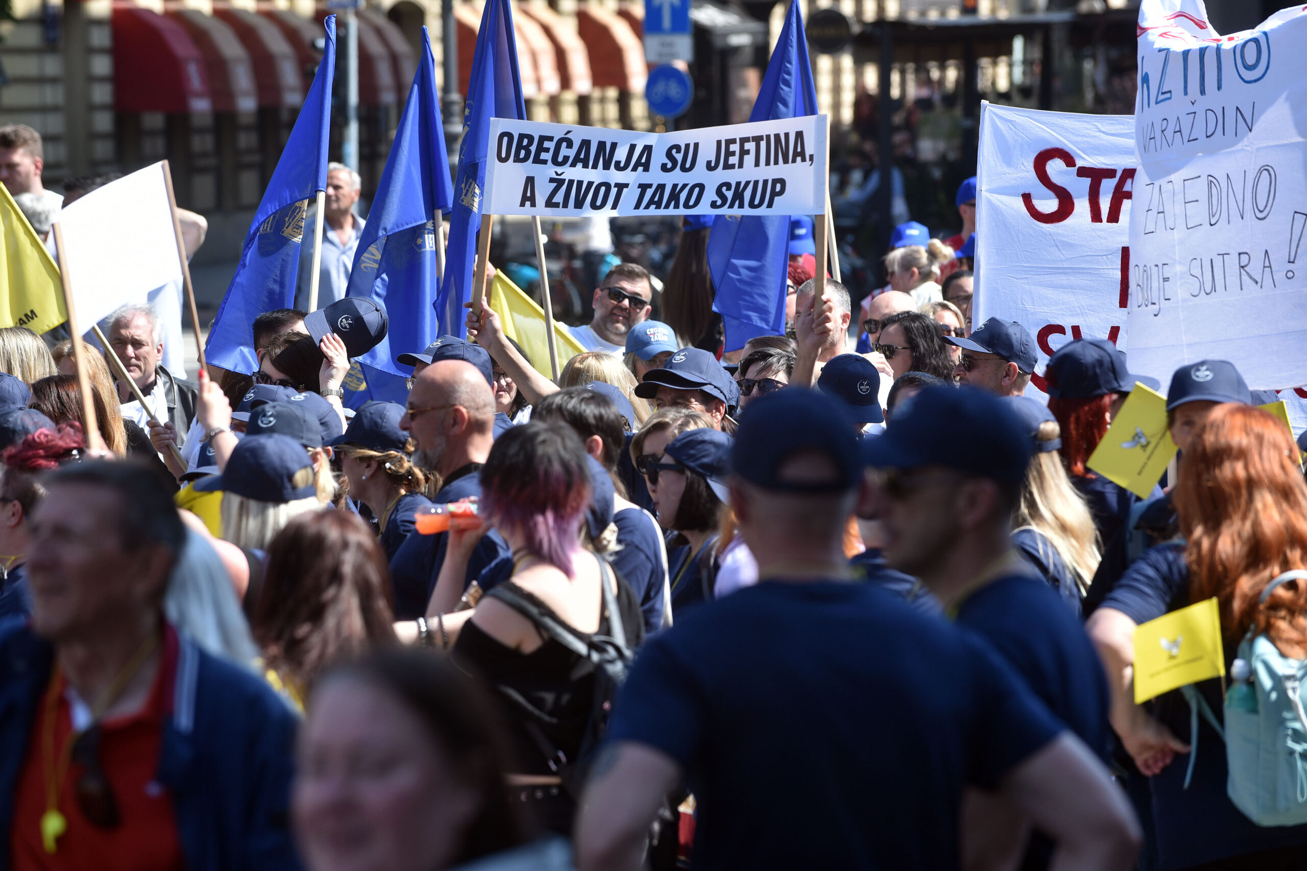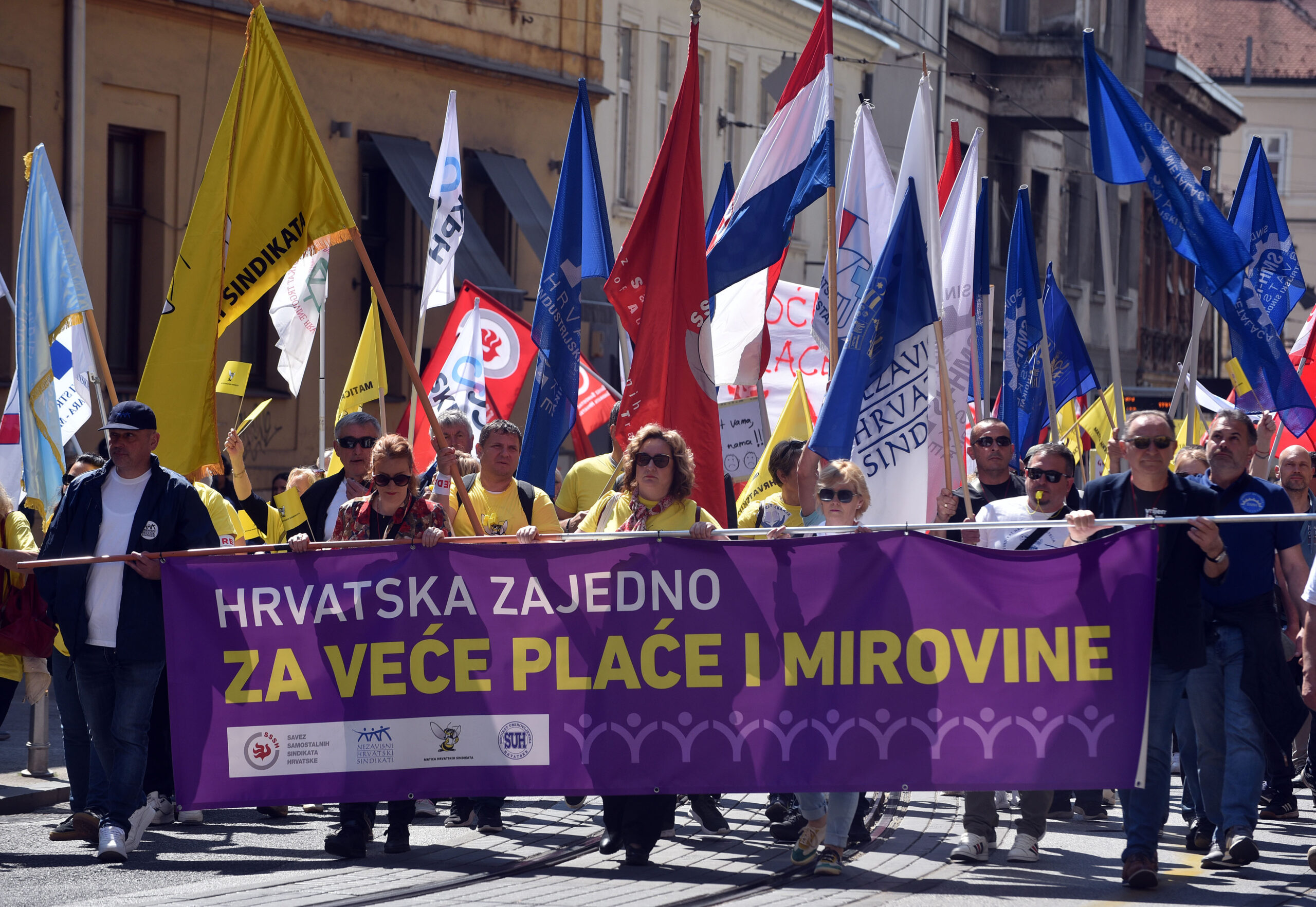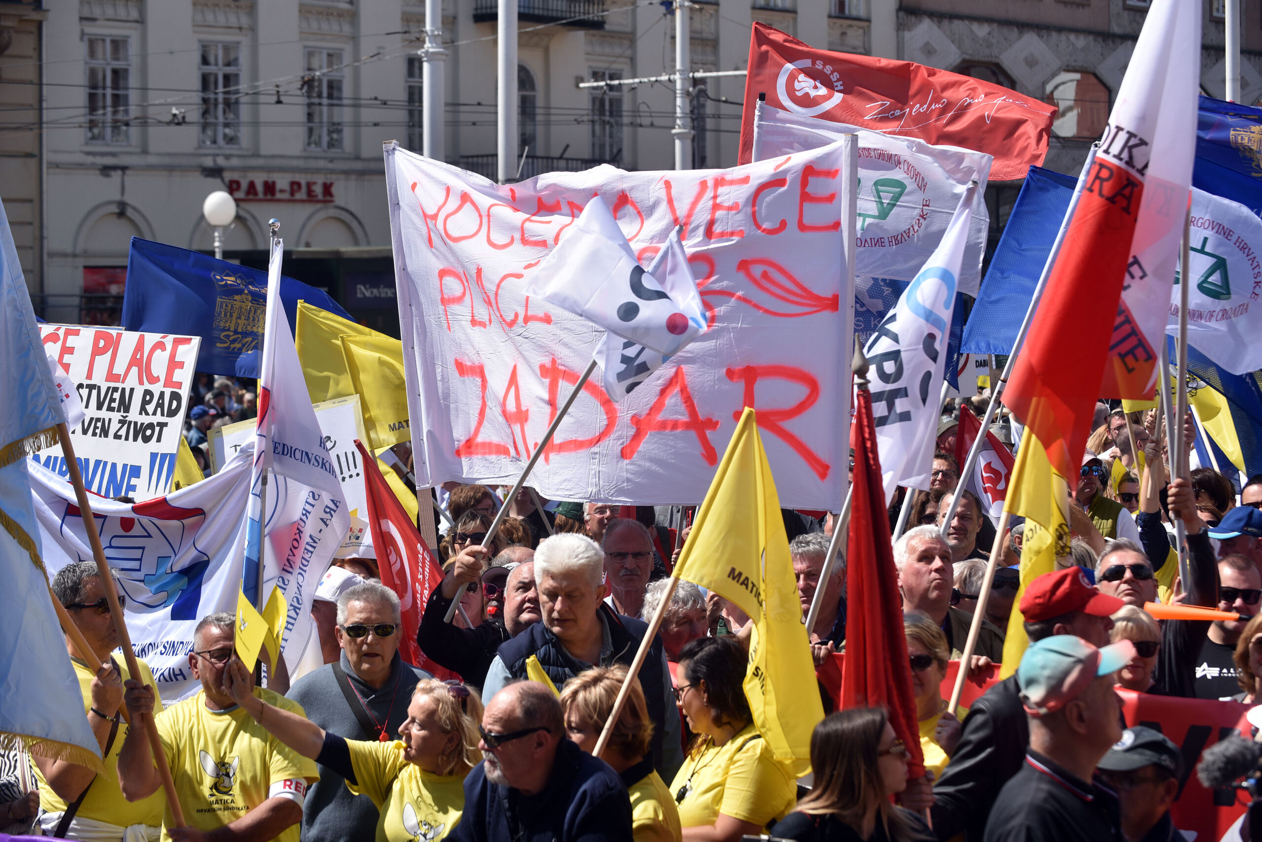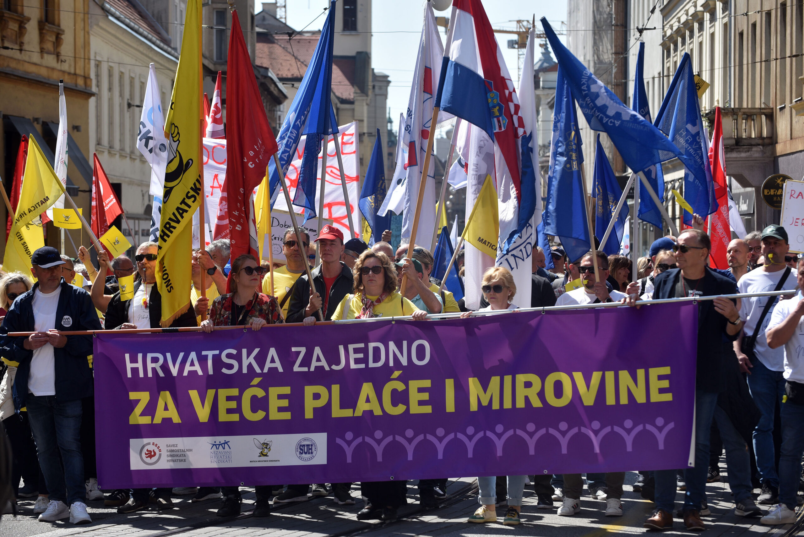 Prosvjed “Hrvatska zajedno za veće plaće i mirovine”, u organizaciji tri sindikalne središnjice SSSH, NHS i MHS te Sindikata umirovljenika Hrvatske (SUH), okupio je u subotu na glavnom zagrebačkom trgu više desetaka tisuća građana, studenata, radnika, umirovljenika i članova sindikata.