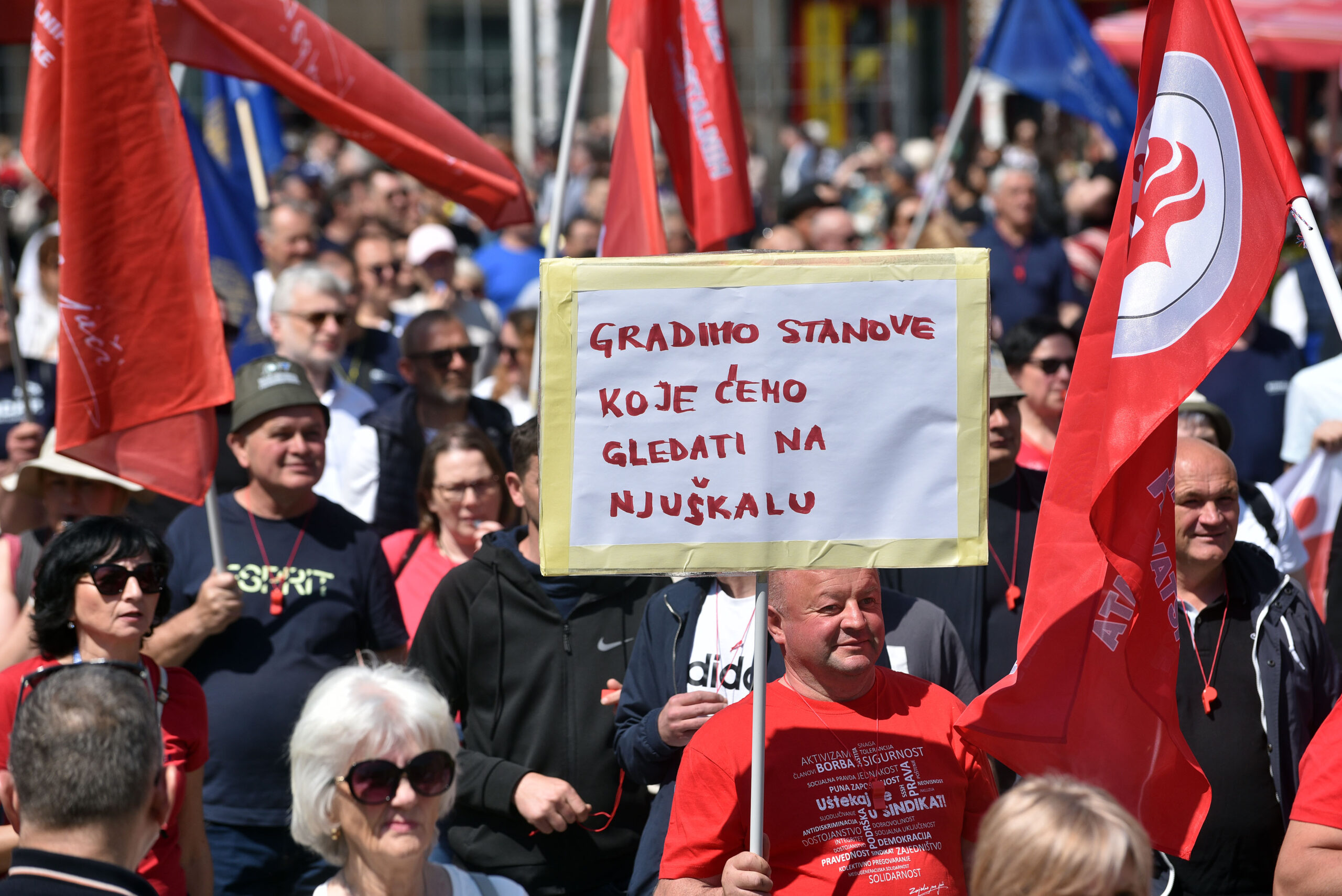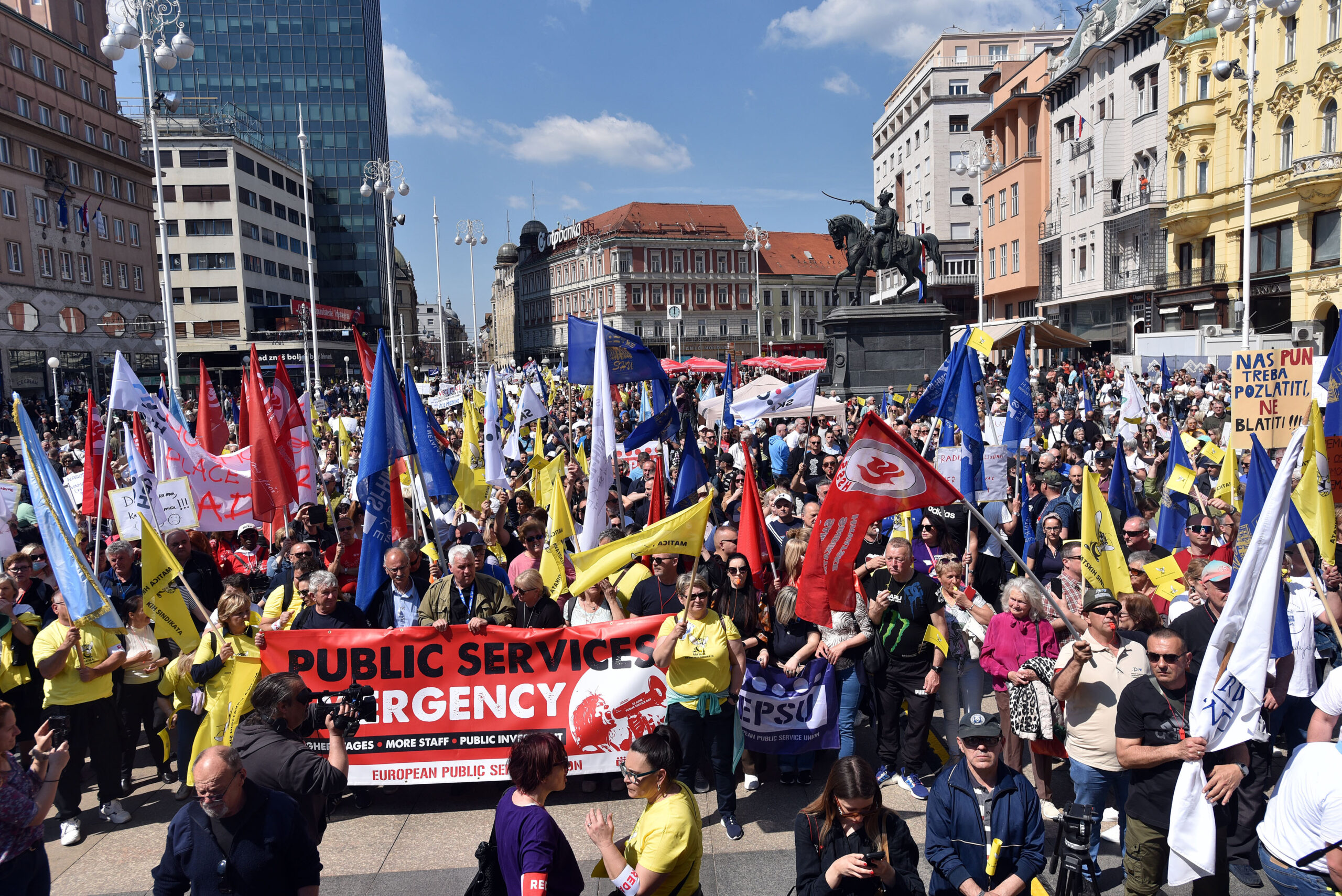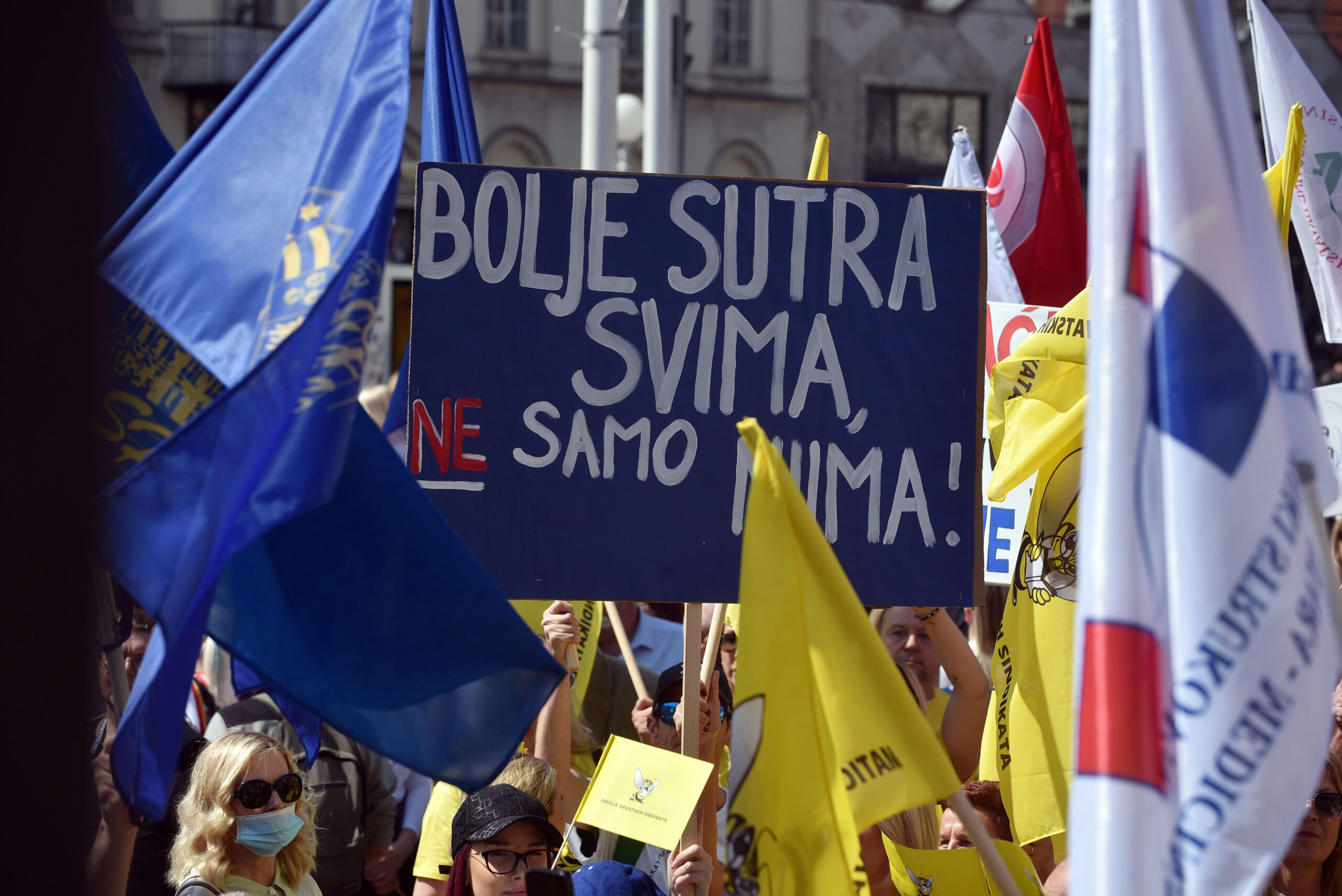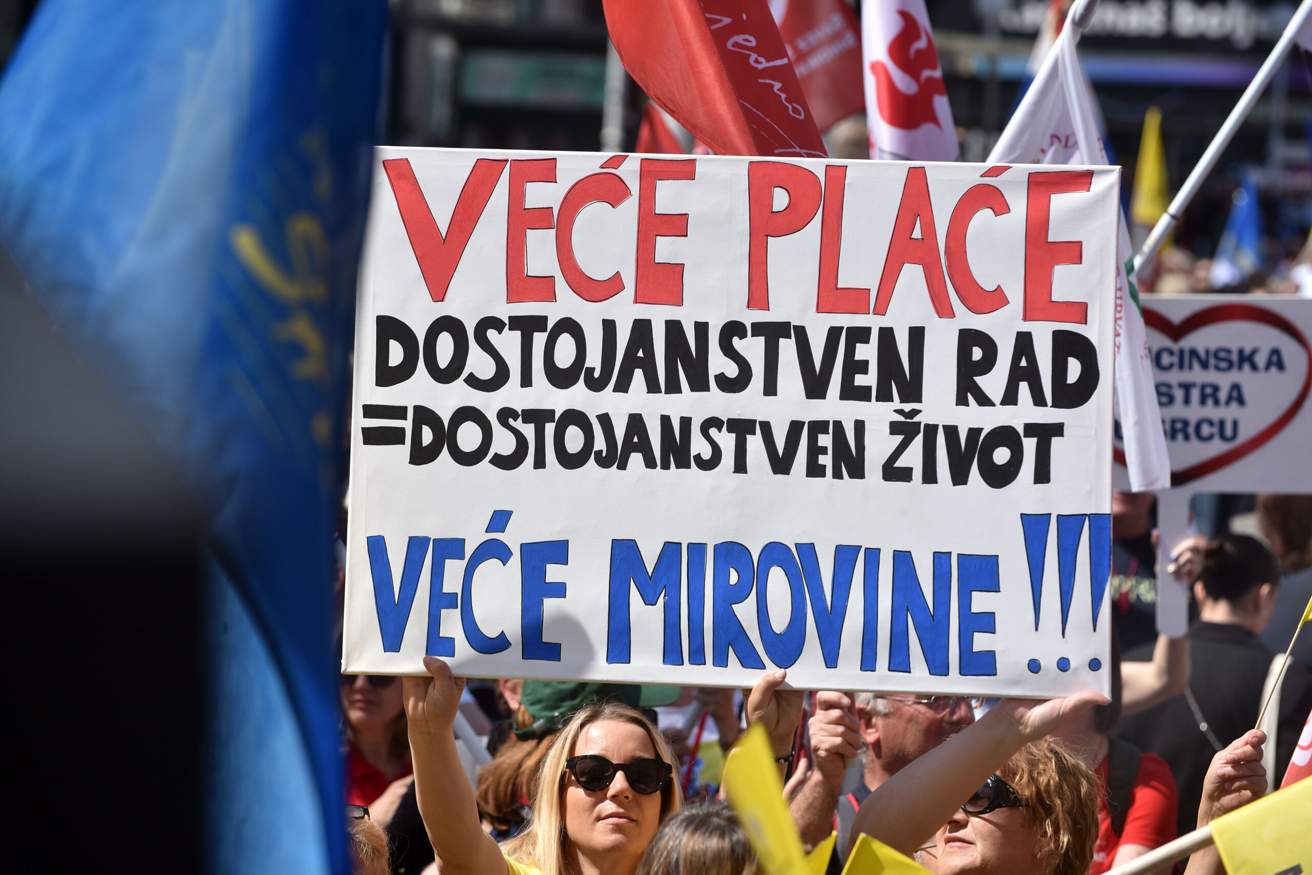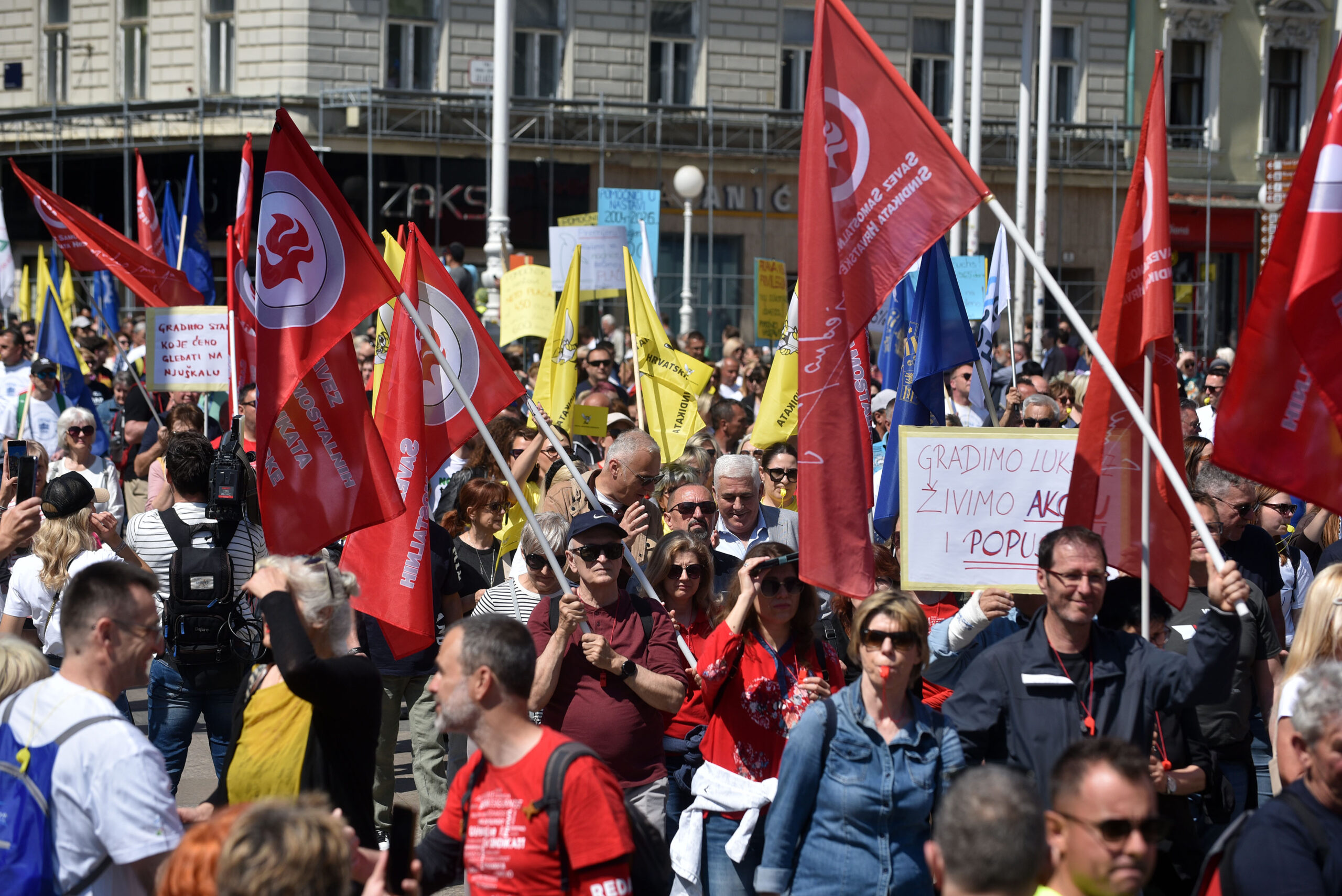 Prosvjed “Hrvatska zajedno za veće plaće i mirovine”, u organizaciji tri sindikalne središnjice SSSH, NHS i MHS te Sindikata umirovljenika Hrvatske (SUH), okupio je u subotu na glavnom zagrebačkom trgu više desetaka tisuća građana, studenata, radnika, umirovljenika i članova sindikata.