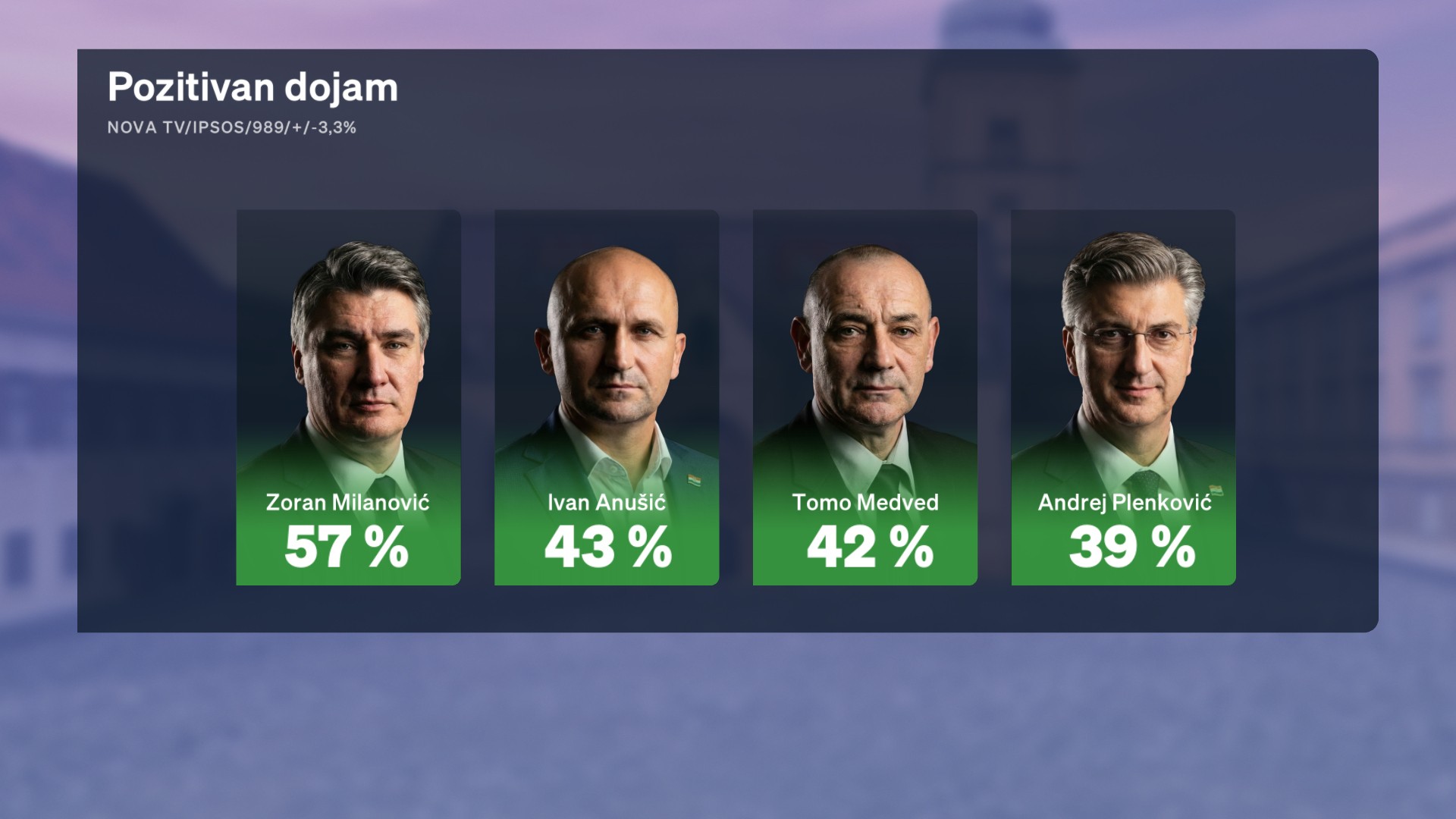 Zoran Milanović političar je o kojem najveći broj građana ima pozitivan dojam. Točnije, njih 57 posto. Slijedi ga ministar obrane Ivan Anušić s 43 posto. Na treće mjesto ovaj mjesec je skočio Tomo Medved s 42 posto.