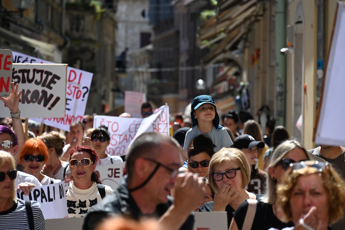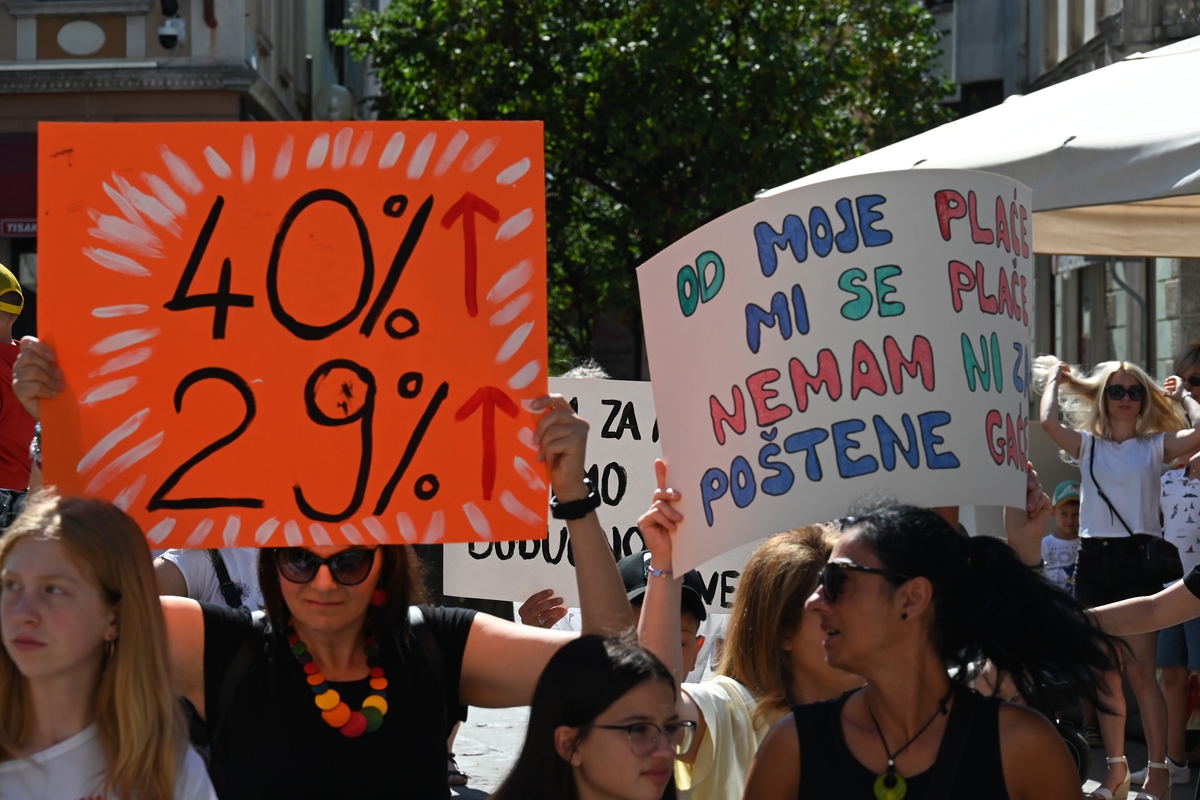 Neodrživu situaciju s plaćama u vrtićima djelatnice predškolskih ustanova rječito su iskazale i brojnim porukama na transparentima, na kojima je, između ostalog, pisalo: “Od moje plaće mi se plače, nemam ni za poštene gaće”, “Neće mladi u vrtiće! Zašto? Male plaće – velika odgovornost”, “Na naše koeficijente ne isplati se ni kladiti”, “Vrtić nije čuvalište” i druge.