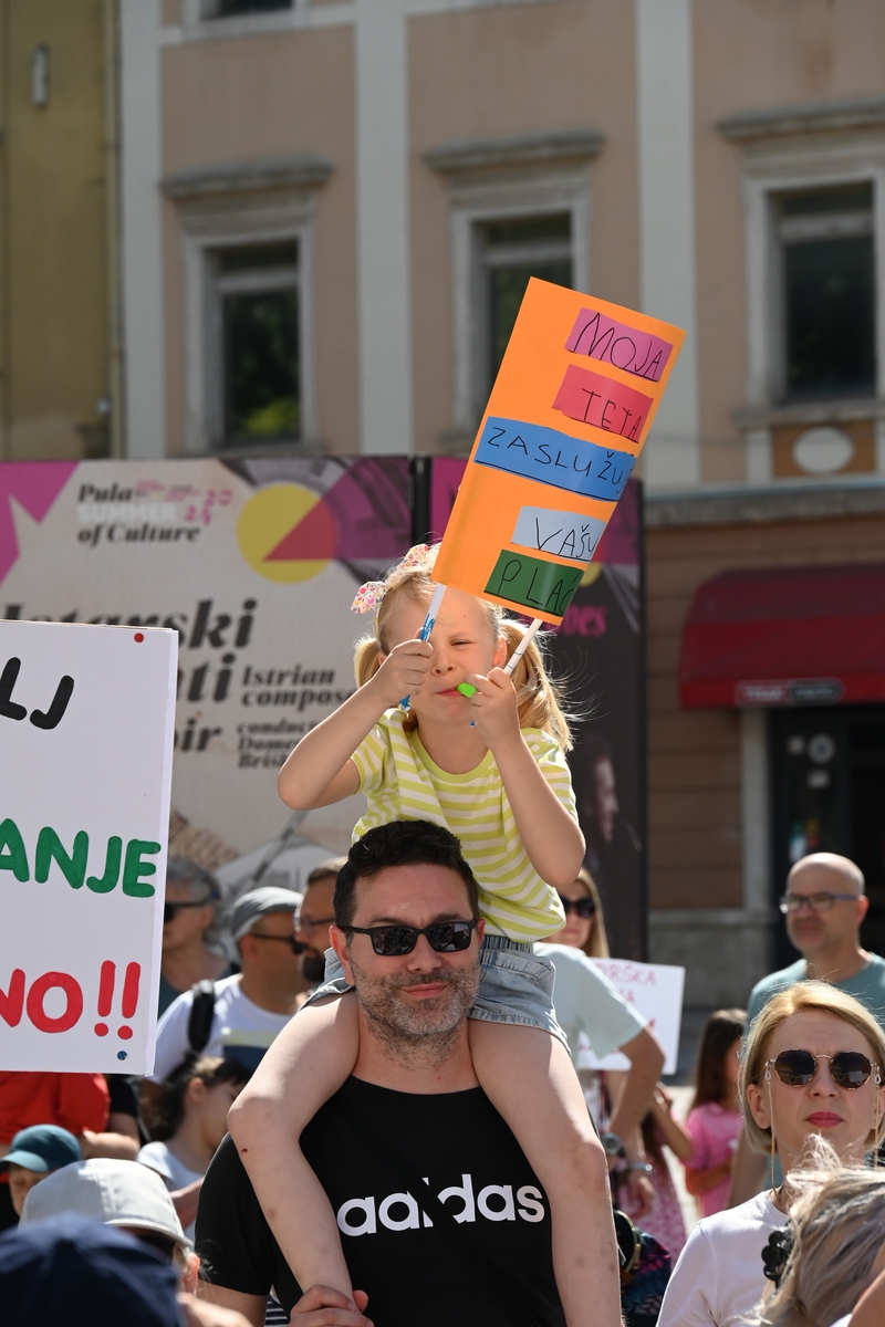 Prosvjed na Portarati održan je nakon što Grad Pula i Sindikat Istre, Kvarnera i Dalmacije nisu uspjeli postići dogovor oko plaća u vrtićima, ni nakon petog kruga mirenja. Inače, u Puli ima oko 300 zaposlenih odgajatelja koji se brinu o brojci od otprilike 1.000 mališana.
