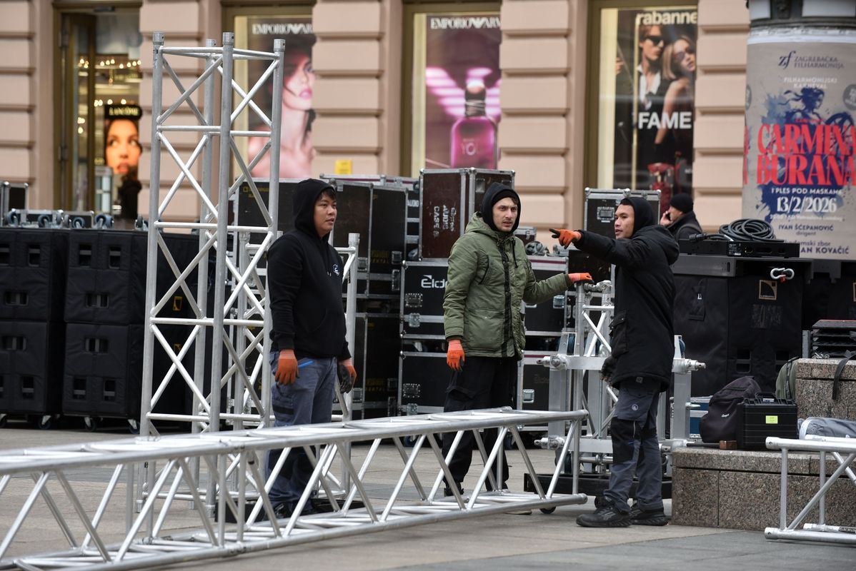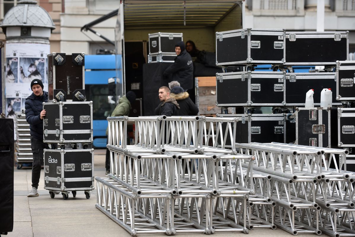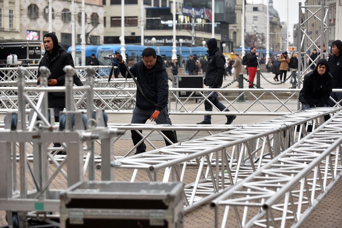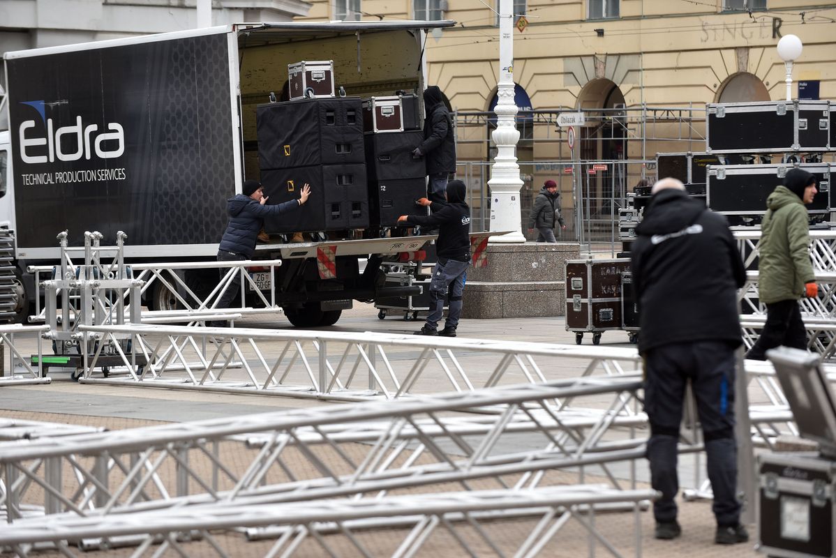 Radnici tvrtke Eldra koja je jučer postavljala pa onda skinula binu, sada ponovo postavljaju binu na glavnom zagrebačkom trgu