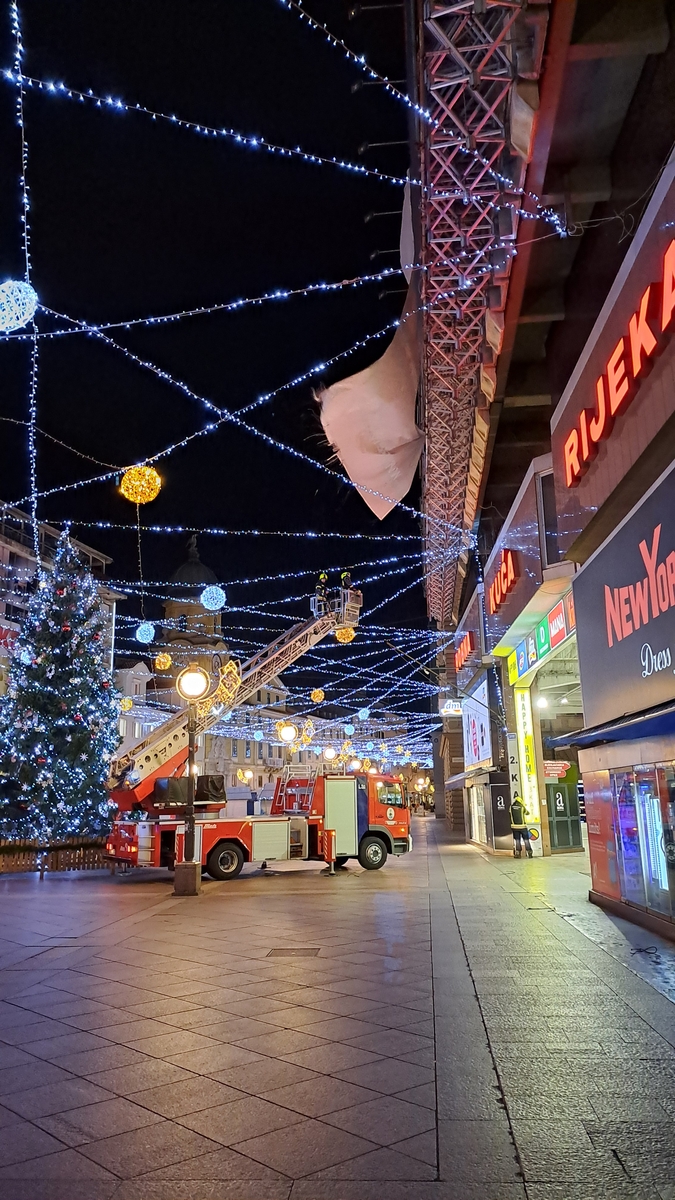 Olujni vjetar otrgnuo je dio reklame na zgradi Robne kuće Ri na Korzu, zbog čega su intervenirali vatrogasci. Fotografije je snimio Ervin Pavleković.
