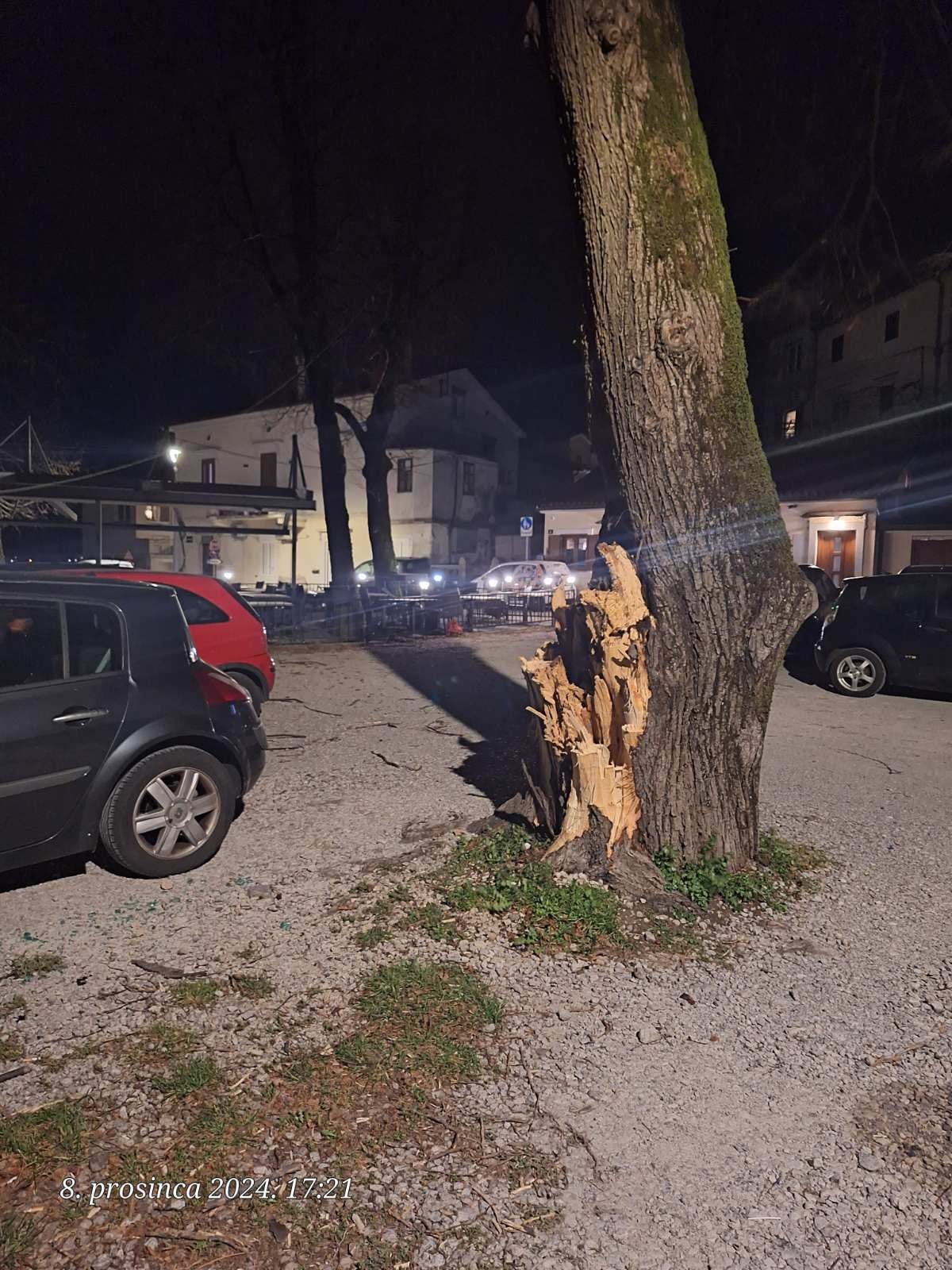 Jaka bura napravila je kaos u Kastvu, na trgu Belveder, gdje je srušeno stablo. Kako se vidi na fotografijama, tom prilikom je oštećen i jedan parkirani automobil.
