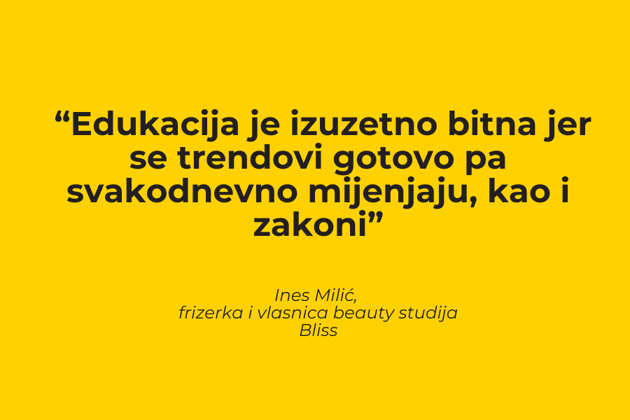 “Za stvaranje uspješnog salona potrebno je mnogo rada, truda i discipline, poslovnog i osobnog usavršavanja, razvoja načina razmišljanja i djelovanja, pažljivog planiranja, razumijevanja tržišta, uspostavljanja dobrih odnosa sa klijentima i suradnicima, te kontinuiranog učenja i usavršavanja”, kaže Milić i dodaje da je u njezinoj branši edukacija izuzetno bitna jer se trendovi gotovo pa svakodnevno mijenjaju, kao i zakoni.