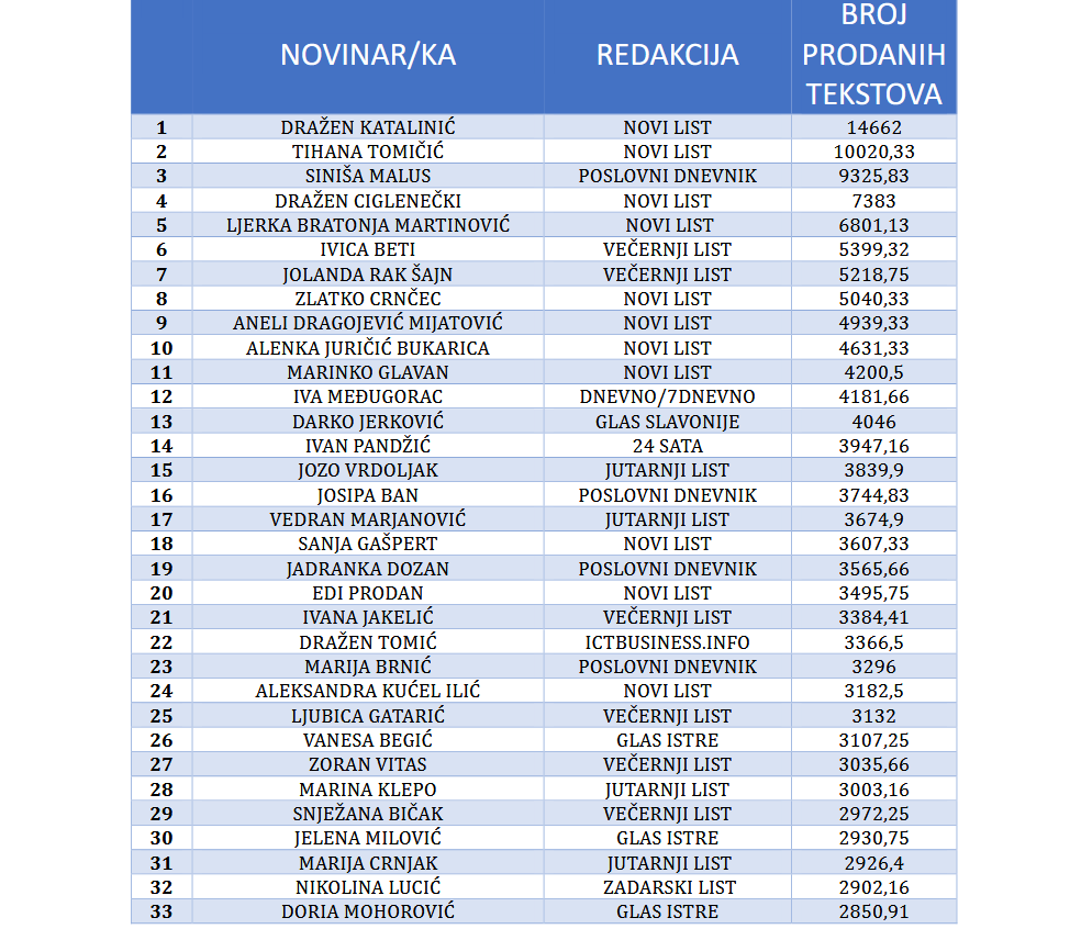 Listu 200 novinara i novinarki tiska i weba u 2025. godini predvodi novinar Novog lista Dražen Katalinić sa 14.662 prodana članka. Slijedi novinarka Tihana Tomičić (Novi list) s 10.020, a treći je Siniša Malus (Poslovni dnevnik) s 9325 prodanih članaka.