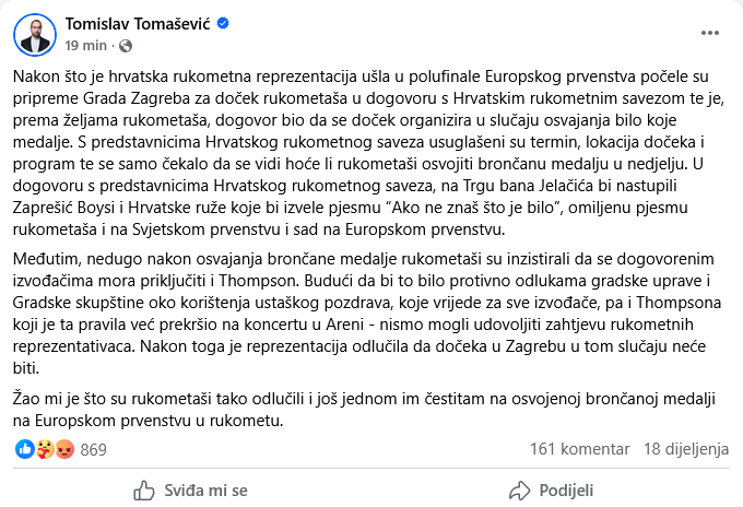 Otkazan je doček rukometaša u Zagrebu, a to je upravo potvrdio zagrebački gradonačelnik Tomislav Tomašević objavom na Facebooku u kojoj se navodi da dočeka neće biti, jer su rukometaši inzistirali da im pjeva marko Perković Thompson.