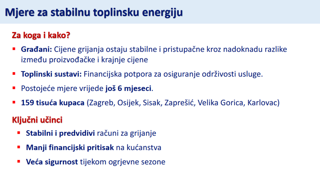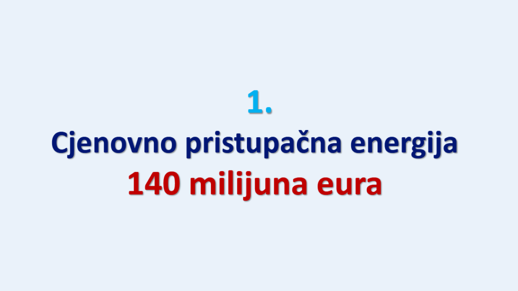 Za cjenovno pristupačnu energiju namijenjeno je 140 milijuna eura. Postojeće mjere produžuju se do 30. rujna ove godine, čime se osiguravaju nepromijenjene cijene električne energije za kućanstva, kao i za mikro, male i srednje poduzetnike s potrošnjom do 250 tisuća kilovatsati, stabilne cijene plina i toplinske energije za građane i javne ustanove poput vrtića, škola, bolnica, domova za starije i druge, rekao je Plenković.