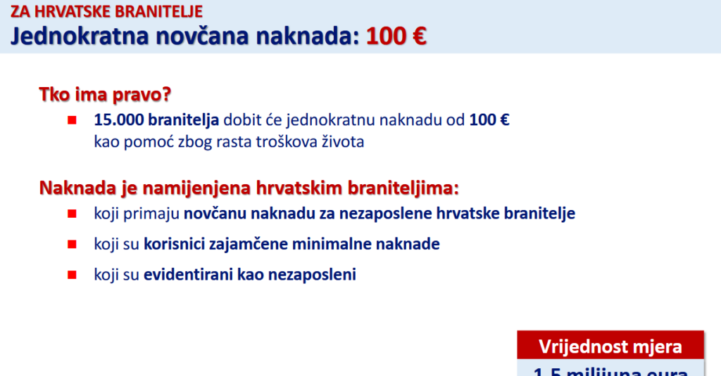 Za oko 15 tisuća nezaposlenih hrvatskih branitelja osigurana je jednokratna potpora od sto eura, kao pomoć u ublažavanju rasta životnih troškova. Ukupna iznos naknade je 1,5 milijuna eura.