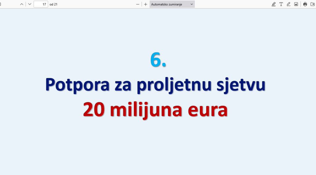Za potporu proljetnoj sjetvi namijenjeno je 20 milijuna eura. Namijenjena je poljoprivrednicima, za sufinanciranje proizvodnih troškova poput sjemena, gnojiva i goriva.