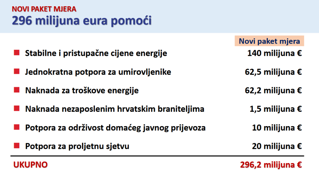 Ukupna vrijednost paketa iznosi 296,2 milijuna eura, a obuhvaća niz ciljanih mjera za koje se očekuje da će imati učinak na kućne budžete građana, poslovanje malih poduzeća, javne i neprofitne institucije, studente, umirovljenike, branitelje i poljoprivrednike.