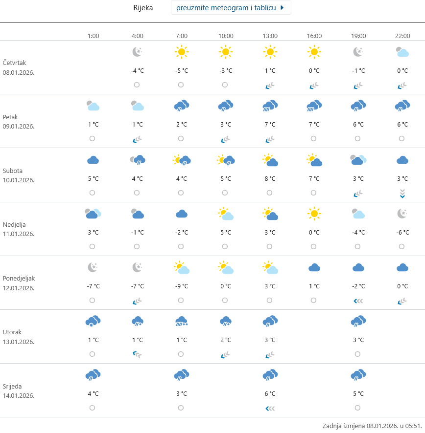 Kako pokazuje meteogram DHMZ-a na području Rijeke ipak neće potrajati ovako hladno razdoblje, pa se u narednih 7 dana očekuje postupno zatopljenje, a zatim i kiša već u petak.