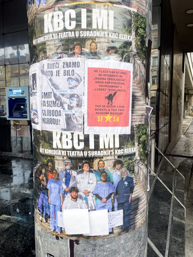 Plakati se nalaze i jedan pored drugog kao što to pokazuje fotografija na kojoj se vidi i da je ispod ovih plakata najavljena i hit komedija, odnosno predstava o KBC-u Rijeka
