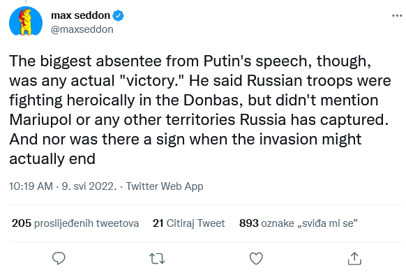 – Najprimjetnije je što su iz njegovog govora izostale bilo kakve riječi o pobjedi. Rekao je da su se ruske trupe herojski borile u Donbasu, ali nije spomenuo Mariupolj ili druge teritorije koje je Rusija zauzela – napisao je.