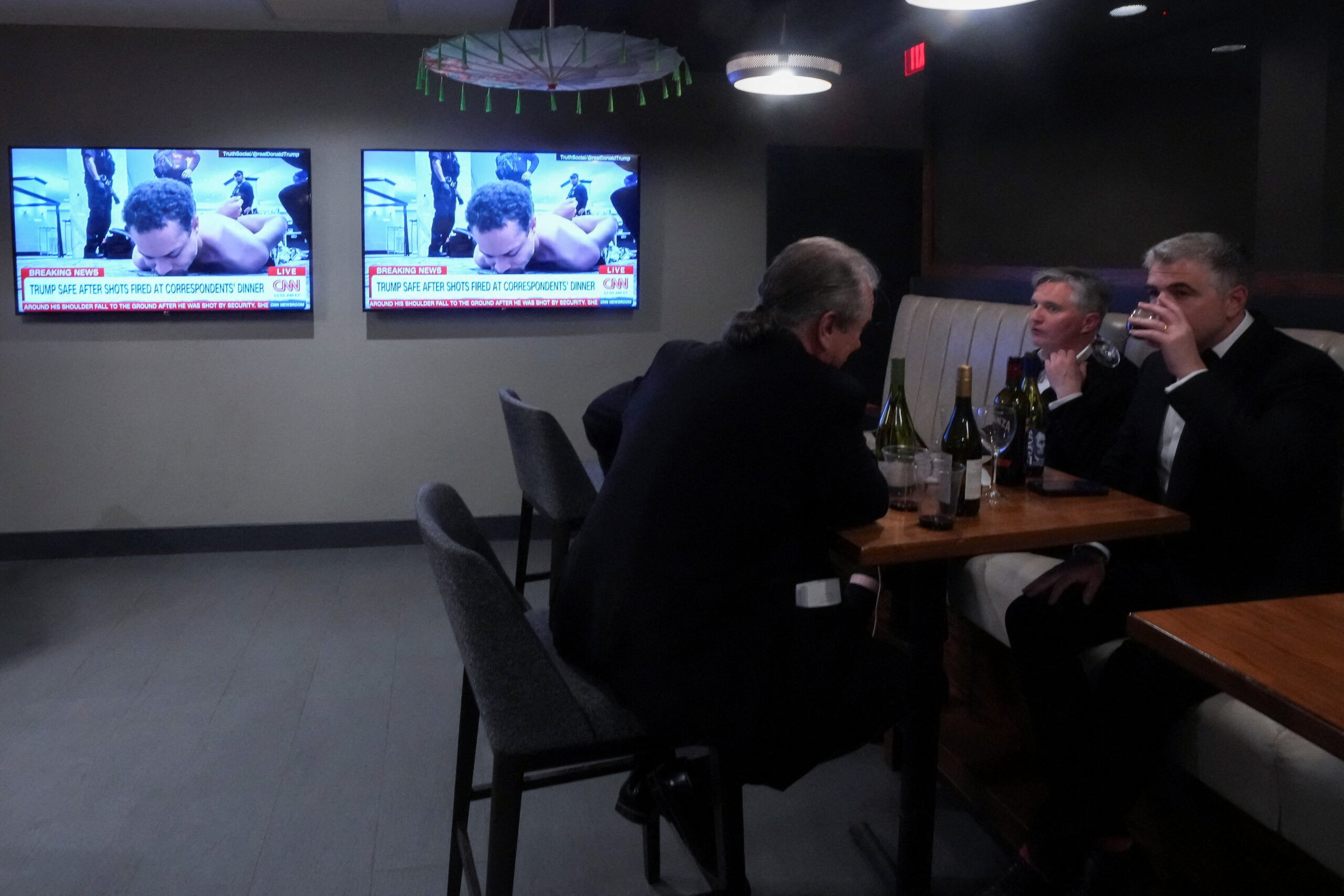 Pripadnici Tajne službe, agencije odgovorne za zaštitu najviših dužnosnika hitro su se popeli s oružjem u rukama na pozornicu ispod velikog transparenta na kojem je pisalo “Udruga dopisnika Bijele kuće” nakon pucnjave da bi izveli najviše dužnosnike na sigurno.