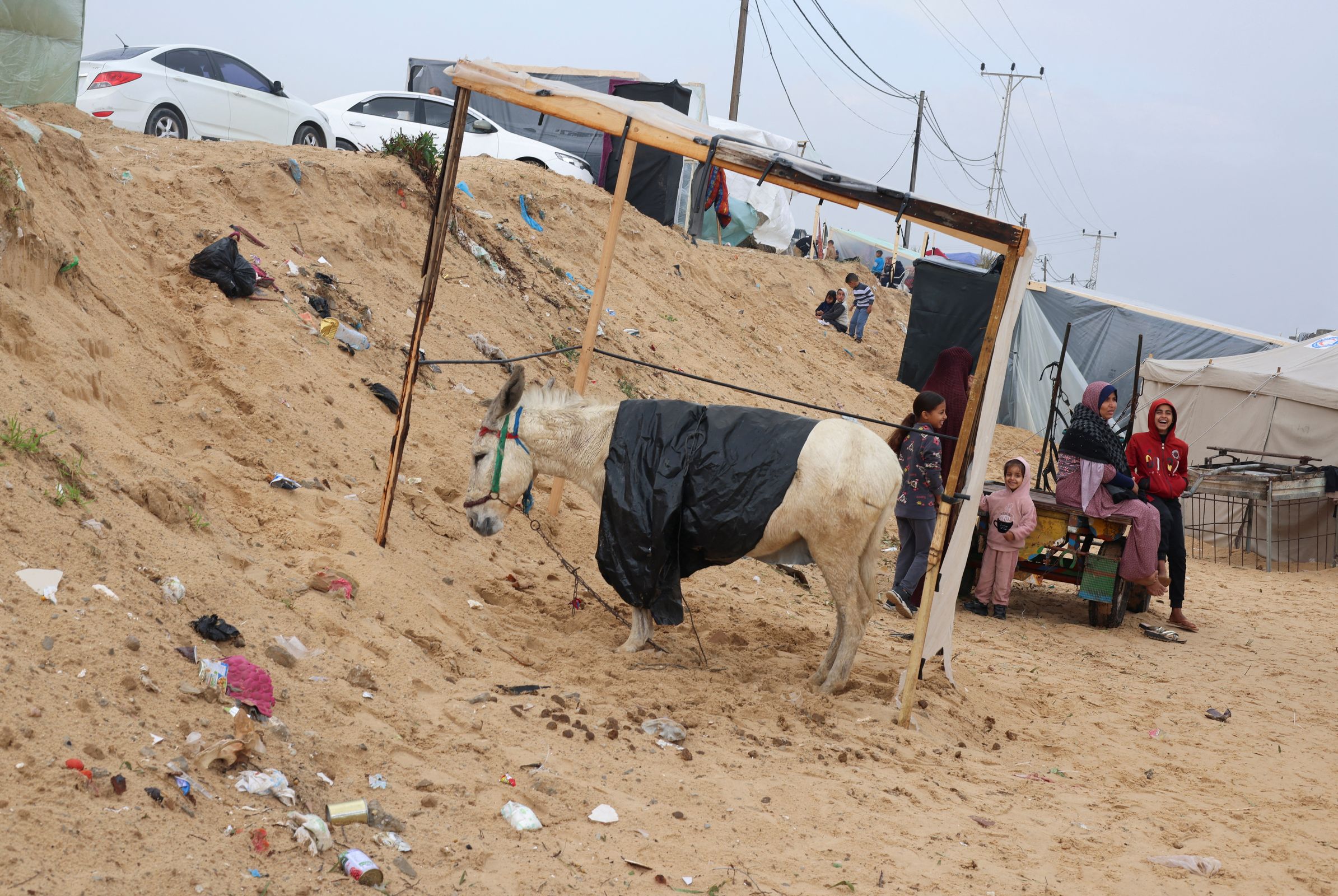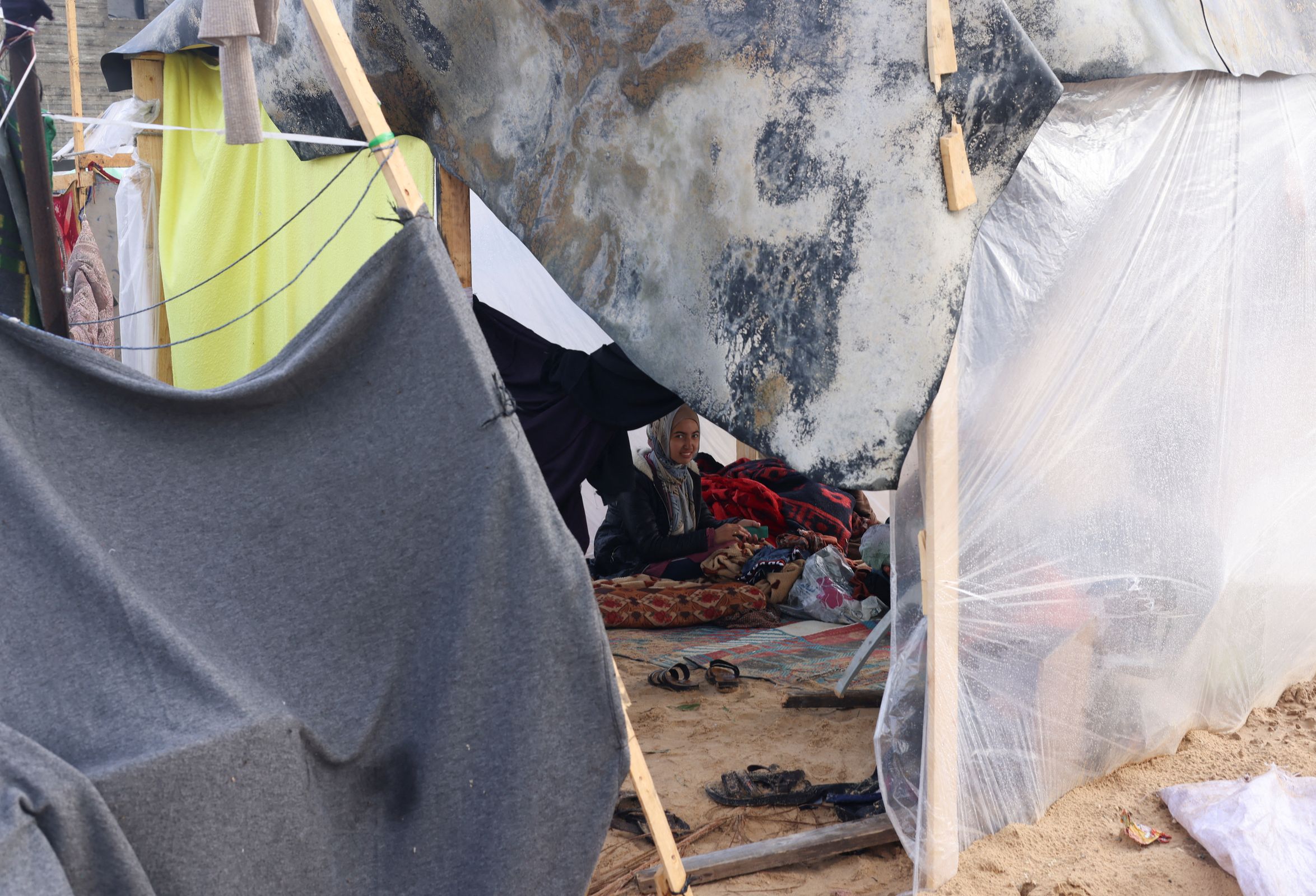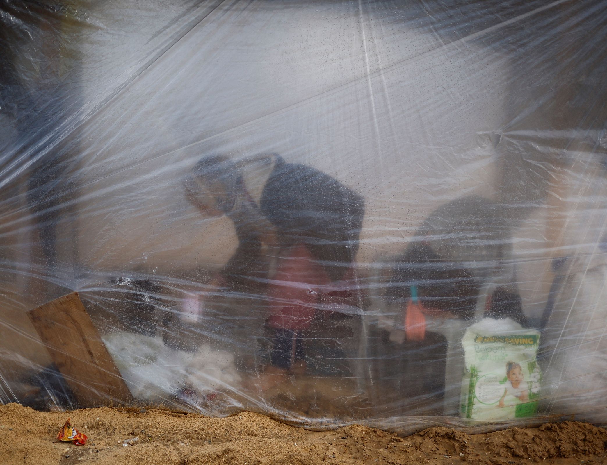 U improviziranom kampu u Rafahu, postavljenom na pješčanom terenu prepunom smeća, ljudi su se u srijedu nastojali oporaviti od užasne noći. Neki su nosili kante s pijeskom da bi pokrili lokve nastale unutar ili izvan šatora u koje su smješteni, a drugi su nastojali osušiti odjeću.