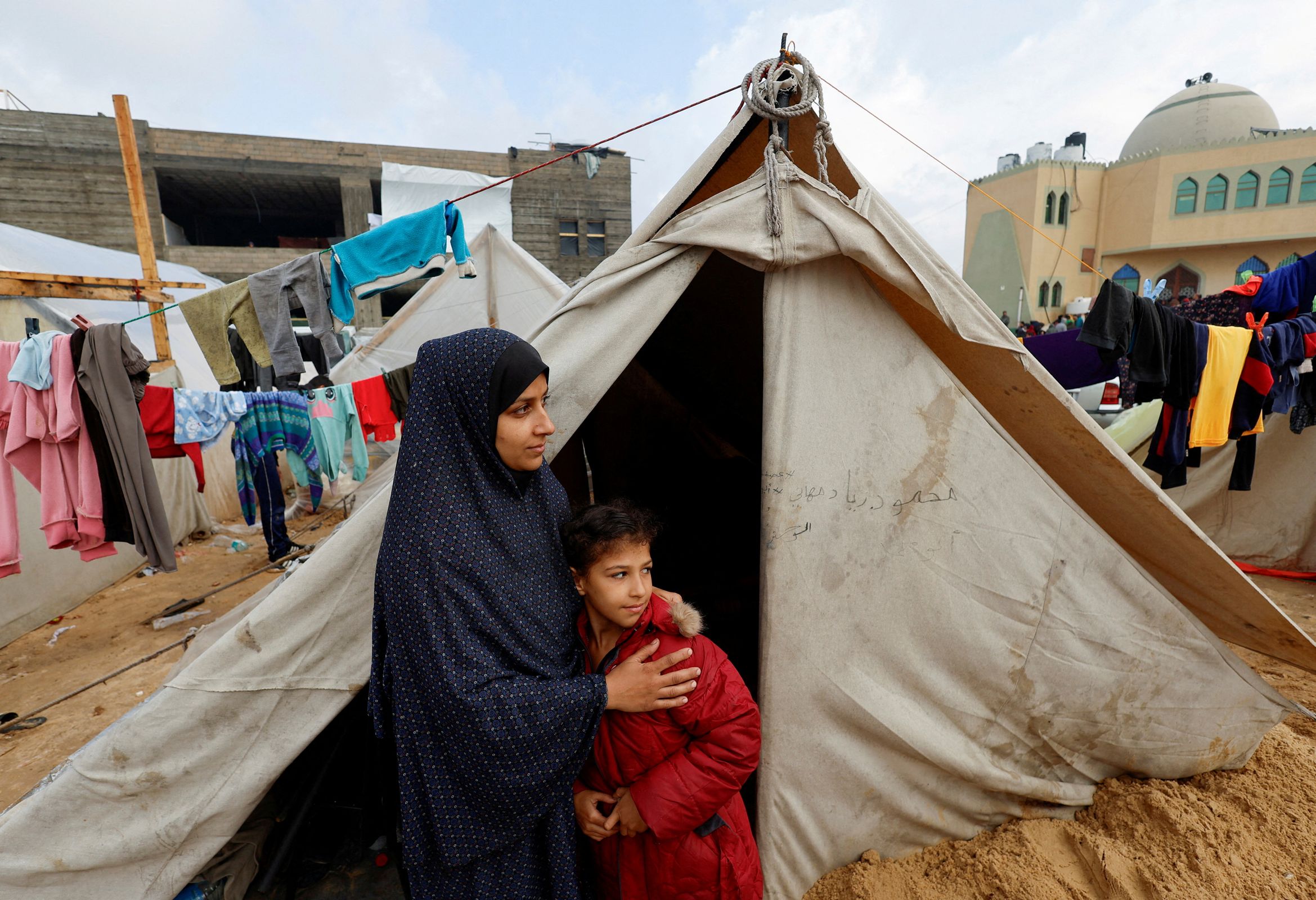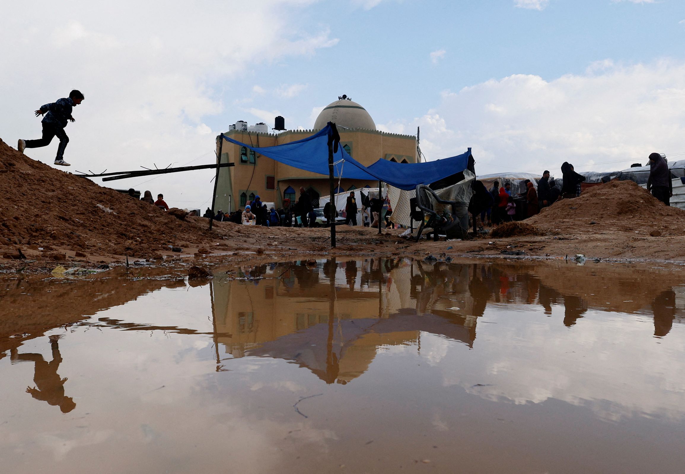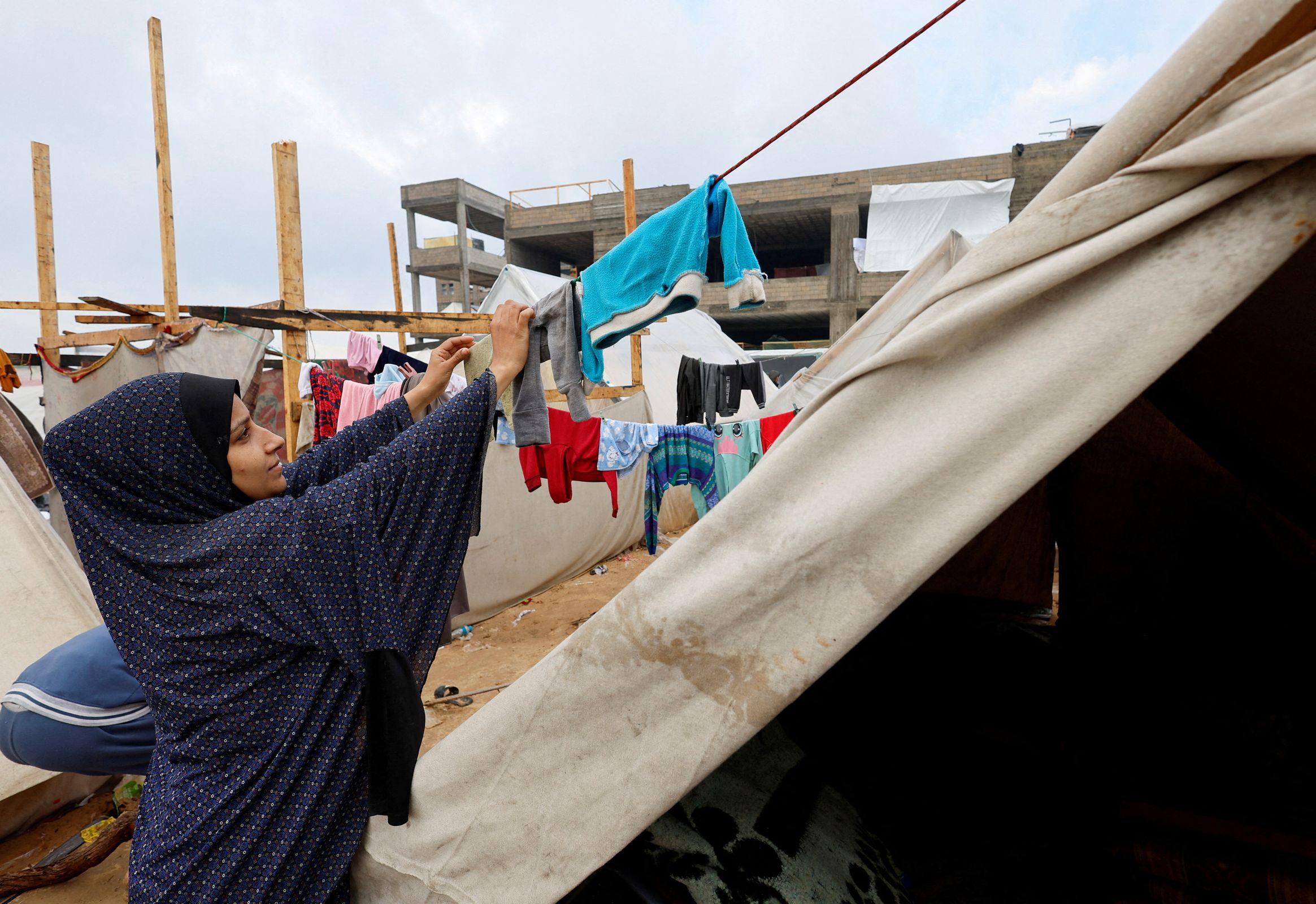 U improviziranom kampu u Rafahu, postavljenom na pješčanom terenu prepunom smeća, ljudi su se u srijedu nastojali oporaviti od užasne noći. Neki su nosili kante s pijeskom da bi pokrili lokve nastale unutar ili izvan šatora u koje su smješteni, a drugi su nastojali osušiti odjeću.