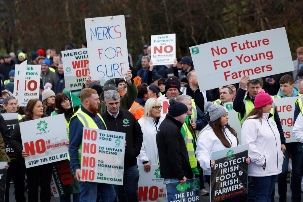 “Ne EU-Mercosur” i “Podrška irskoj poljoprivredi” pisalo je na transparentima izvješenima na nekima od brojnih traktora koji su se slijevali prema malom mjestu smještenom na pola puta između Dublina i Galwaya, dan nakon europskog zelenog svjetla tom sporazumu.