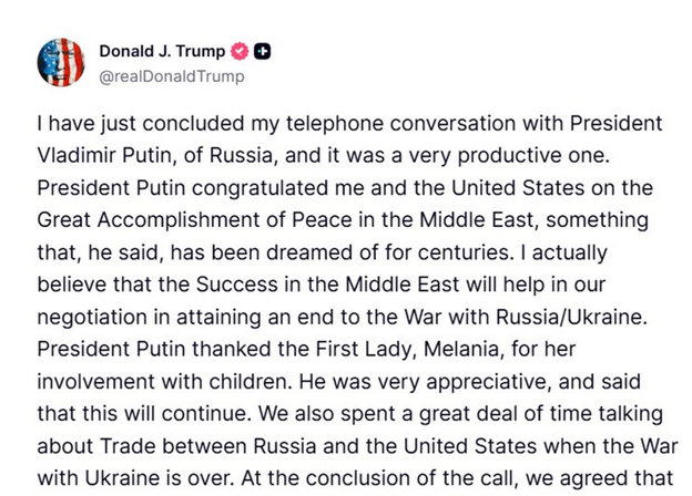 “Upravo sam završio telefonski razgovor s predsjednikom Vladimirom Putinom iz Rusije i bio je vrlo produktivan. Predsjednik Putin čestitao je meni i Sjedinjenim Državama na velikom postignuću – uspostavi mira na Bliskom istoku, nečemu o čemu se, kako je rekao, sanja stoljećima.