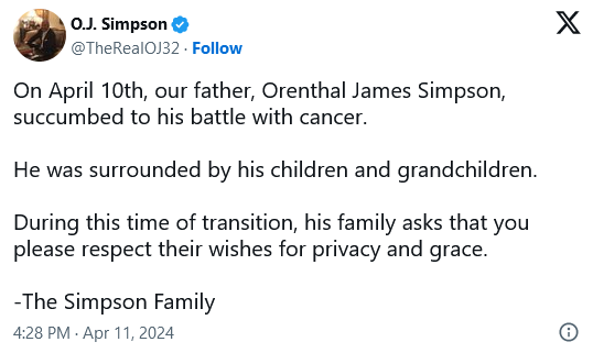 Kako stoji u poruci na Twitteru umro je okružen svojom djecom i unucima.