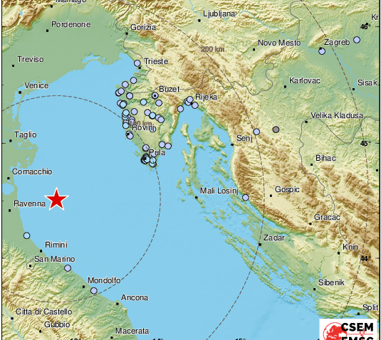 Potres su seizmografi Seizmološke službe zabilježili u 12 sati i 56 minuta, a dogodio se u podmorju sjevernog Jadrana, uz talijansku obalu u blizini Ravenne.