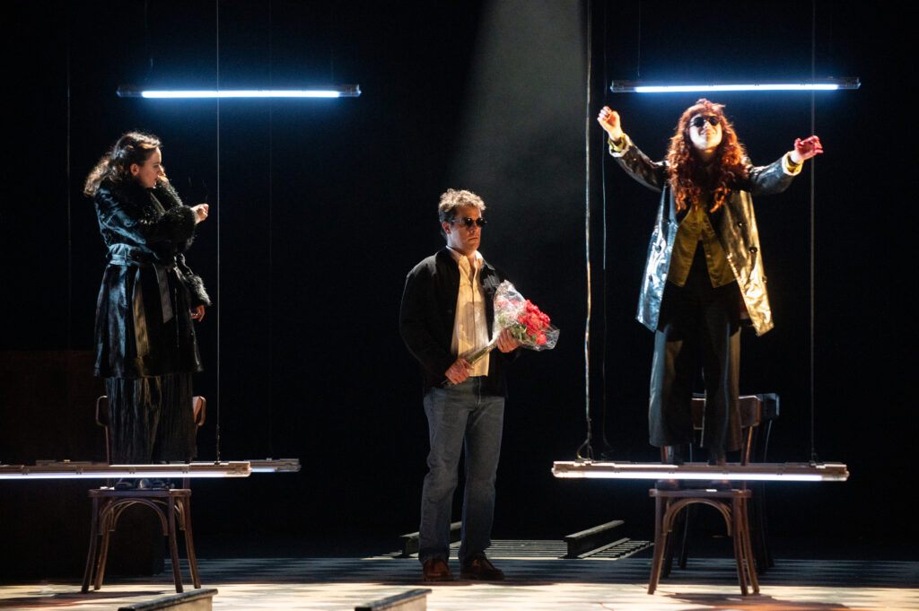 Pod neonskom rasvjetom, koja simbolički mijenja boje (scenografkinja je Katie Davenport, a oblikovatelj svjetla Paul Keogan), gotovo čitava radnja predstave odvija se u restoranu i vrti oko Mirandoline i pijanih, oženjenih muškaraca koji je nastoje osvojiti, između ostalog i skupim darovima. Pritom su prizori – u kojima se za stolovima gostionice raspravlja o odnosima muškaraca i žena, majki i sinova/kćeri, spominje patrijarhat, tematiziraju transgeneracijske ženske traume, progovara i o silovanju – režirani uglavnom statično i monotono, uz poneku glazbenu kulisu Anne Mullarkey, a predstava se – s brojnim digresijama – razvukla na dva sata i 45 minuta. Dotaknuto je i pitanje odnosa života i kazališta, stvarnosti i iluzije, što je vizualno naznačeno kazališnim lampicama u prednjem dijelu pozornice.