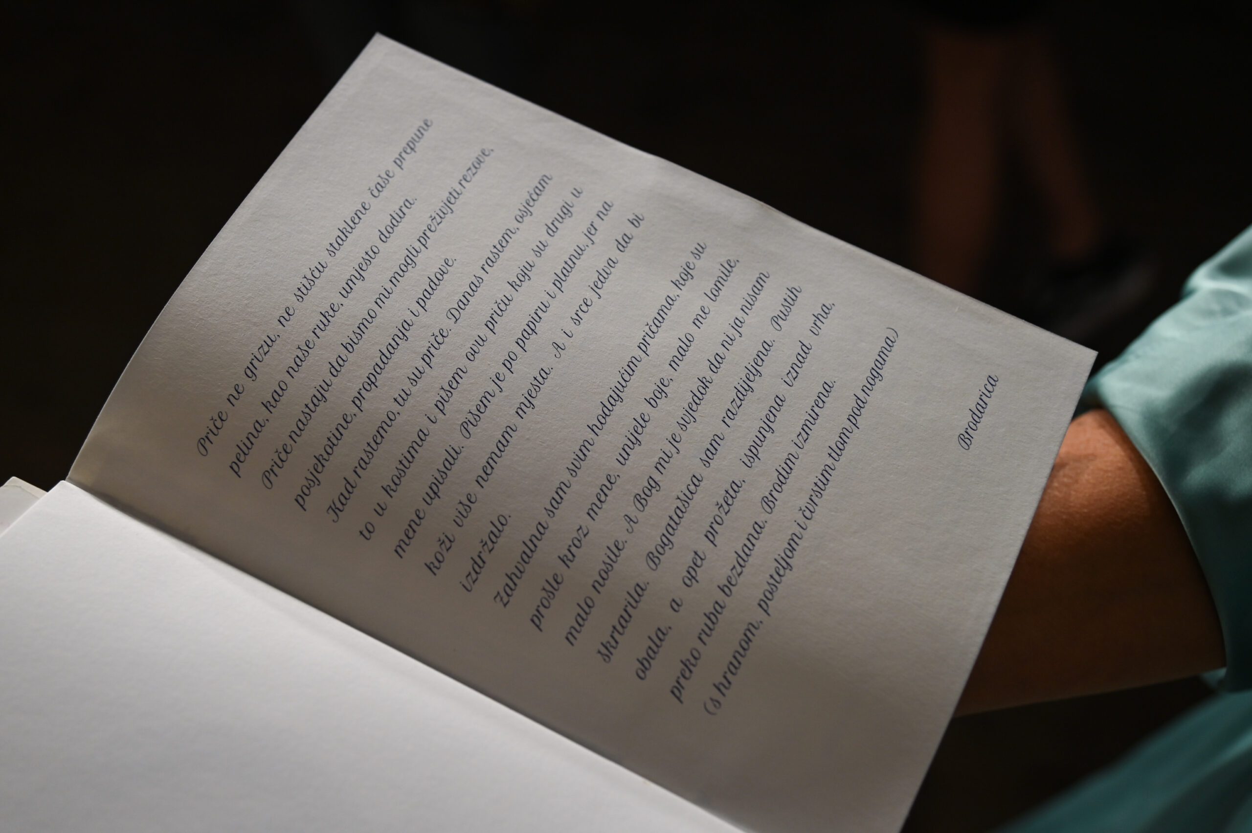 Izložba je otvorena u srijedu navečer, u prisnoj i toploj atmosferi uz gitaru, violinu i pjesmu u izvedbi glazbenica Slađane Čolović i Maje Veljak. Između pjesama, Margareta je publici prenijela intimne stihove poezije koja je od Brodarice neodvojiva, odnosno, koja ju čini. Zapravo, kako nam je objasnila, od poezije je sve i počelo.