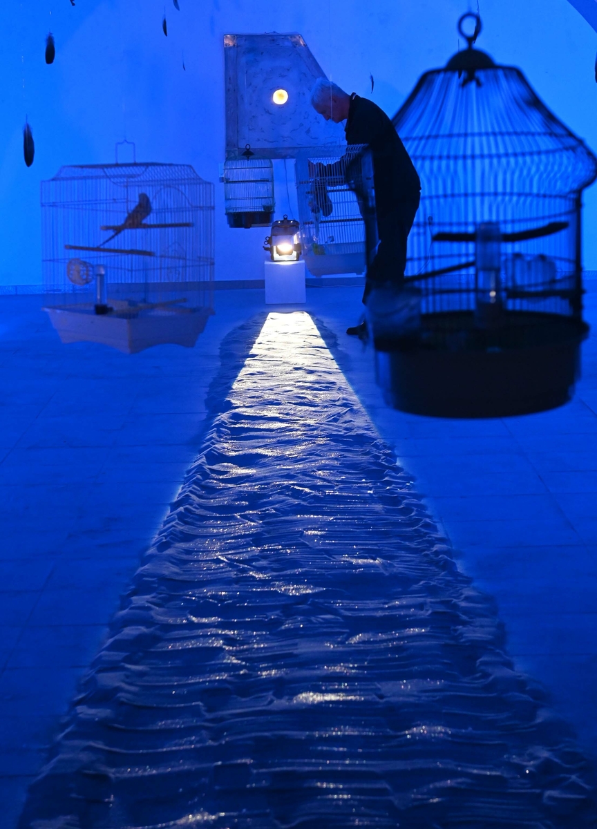 Iako vizualno estetičan, postav skriva snažnu kritiku umjetnosti i stvarnosti. Gotovo sve u galeriji u plavom tonu svjetlosti je umjetno, savršenije od prirode, dok se prava bit krije u živim pticama koje personificiraju pet kontinenata i život na Zemlji.