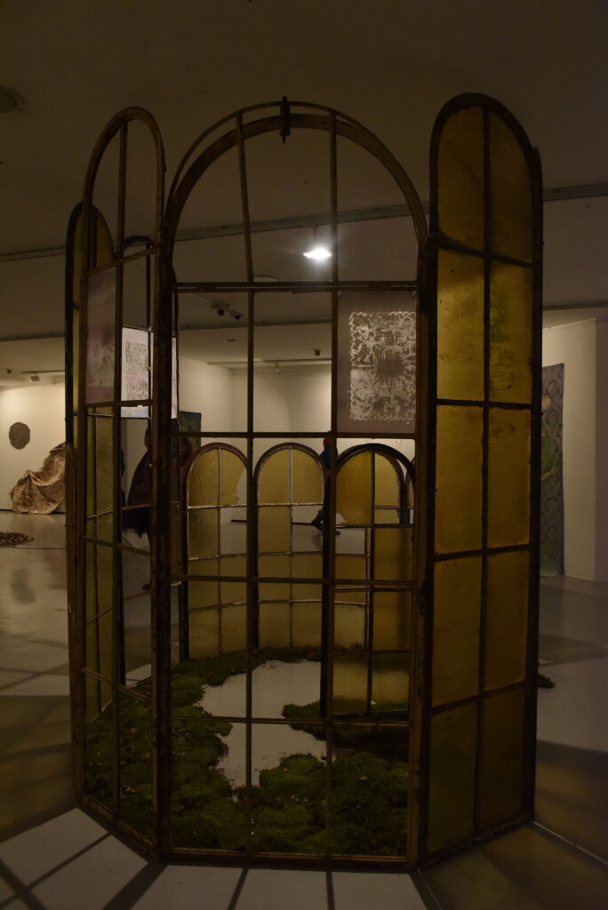 – Unutar strukture, svjetlost prodire kroz pukotine i stara stakla, ali i kroz nove otisnute i oslikane dijelove u batik tehnici koji su postavljeni u pojedinim prazninama poput vitraja. U sredini instalacije, na podu je mahovina kojom prizivam osjetilni doživljaj šumske prisutnosti. Mahovina ne cvjeta bučno. Ona raste polako, neupadljivo, u tišini i sjeni. U tom smislu simbolizira unutarnju tišinu, strpljenje, skromnost i snagu tihe prisutnosti — kvalitete koje se ne nameću, ali traju, objašnjava umjetnica.