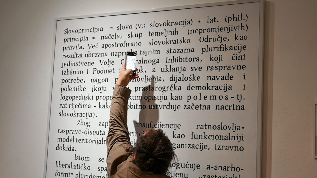 Poticaj za pisanje, kaže autorica, pronašla je u slavnome Orwellovu romanu »1984« i njegovoj interpretaciji totalitarnih režima, s kakvima se i danas suočavamo. Poput Orwella, koji je kreirao rječnik »novozbora«, i autorica kreira novokovanice, od kojih su za ovu izložbu ključne novoriječi »slovokracija«, »slovosenat«, »slovoprincipia«, »slovostijeg«, »slovograničnik«, »slovoistina« te »slovomanifest«.