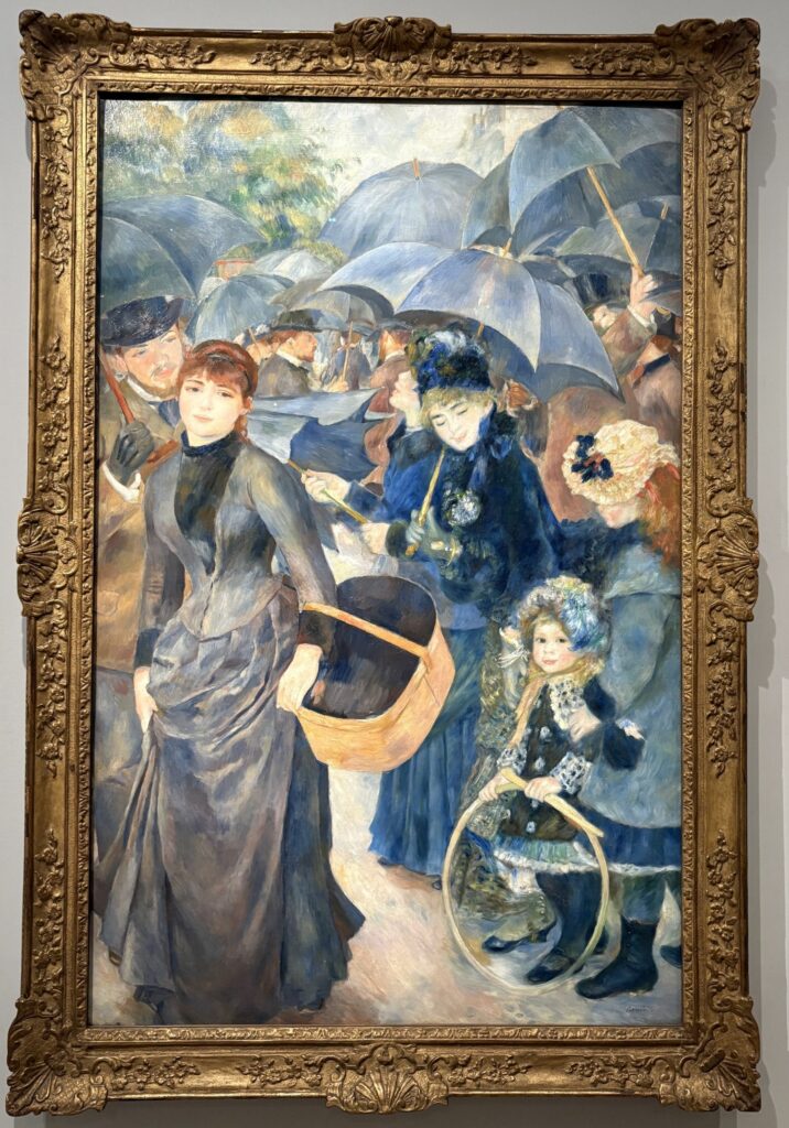 Kišobrani su Renoirovo posljednje veliko djelo s urbanom tematikom i posljednje u kojem je njegov ideal romantične i sretne modernosti u potpunosti izražen. Tema mu omogućuje da objedini motive para, obitelji i gomile u gustoj sceni u kojoj se figure, planovi, oblici i boje međusobno odražavaju, preklapaju i prožimaju. Unatoč gužvi i kiši, prevladavaju sklad, nježnost i radost. Zajednička radost življenja i ljubavi – osjećaj živosti i uživanja u ljepoti svijeta u svakom trenutku, čak i u onom najobičnijem.