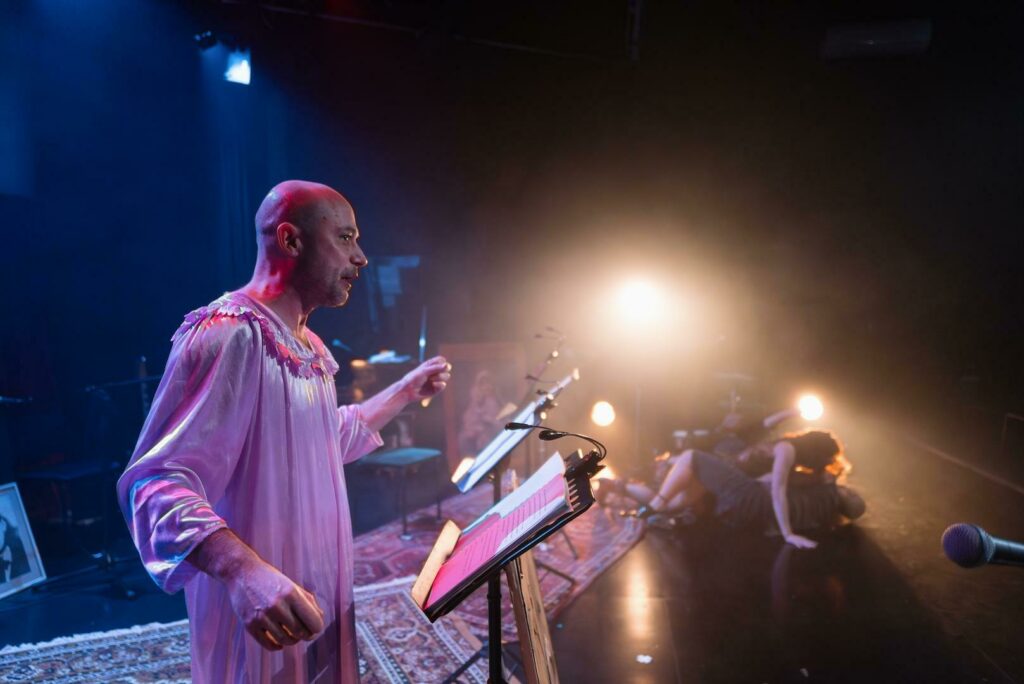 Jelena Miholjević penje se na scenu MM Centra u Teatru &TD iz »podzemlja« foajea, širom razjapljenih usta, s pankerski natapiranom kosom, držeći pod ruku Deana Krivačića, odjevenog u ružičastu haljinicu nalik spavaćici naših baka i najjeftinije plastične smeđe natikače (kostimografija: Ana Mikulić). On se potom glasa zvukovima ljupkih, gakavih pačića; ona razumije njegov jezik i prijanja uz klavir smješten u stražnjem dijelu pozornice (glazba: Damir Šimunović), nastavljajući razgovor muziciranjem. Cirkusantsko tijelo Laure Čerina rasteže se u špagu, uvodeći u izvedbu elemente farsičnog cirkusiranja. Nikola Nedić javlja se ritmovima električne gitare, negodovanja, gnjeva, žalosti. Mali kor glumaca naizmjence govori rečenice Janka Polića Kamova iz zbirke »Novele i lakrdije« (1908.). O tome sâm Kamov zapisuje:
