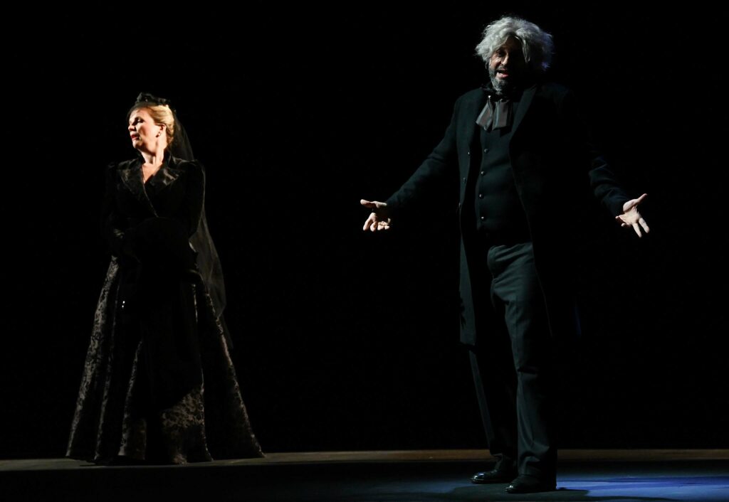 U kontekstu režijski ovako postavljene predstave teško je govoriti o glumačkim kreacijama u klasičnom smislu riječi, jer osim što su morali izgovoriti velike količine teksta i to su učinili korektno, naglašavajući ljepotu talijanskog jezika, glumicama i glumcima uglavnom nije pružena prilika da kreiraju likove koji bi bili »od krvi i mesa«, već su ostali nekako »papirnati«, tek kao nositelji određenih ideja autora, no bez dubljeg psihološkog poniranja. Ženu koja piše i Jun Rail tumači Beatrice Vecchione, Gospodin Rail je Dario Battaglia, Hectora Horeaua igra Federico Palumeri, Pekisch je Mirko Soldano, lažnu udovicu Abegg glumom i pjevanjem utjelovila je Leonora Surian Popov, Andersson je Andrea De Luca, Bonetti je Giuseppe Nicodemo, Bonellija tumači Andrea Tich, Brath je Jacopo Squizzato, zbor triju sluškinja u kući Railovih glume Aurora Cimino, Serena Ferraiuolo i Noemi Grasso, a ulogu Pehnta igra djevojčica Emily Popov Surian.